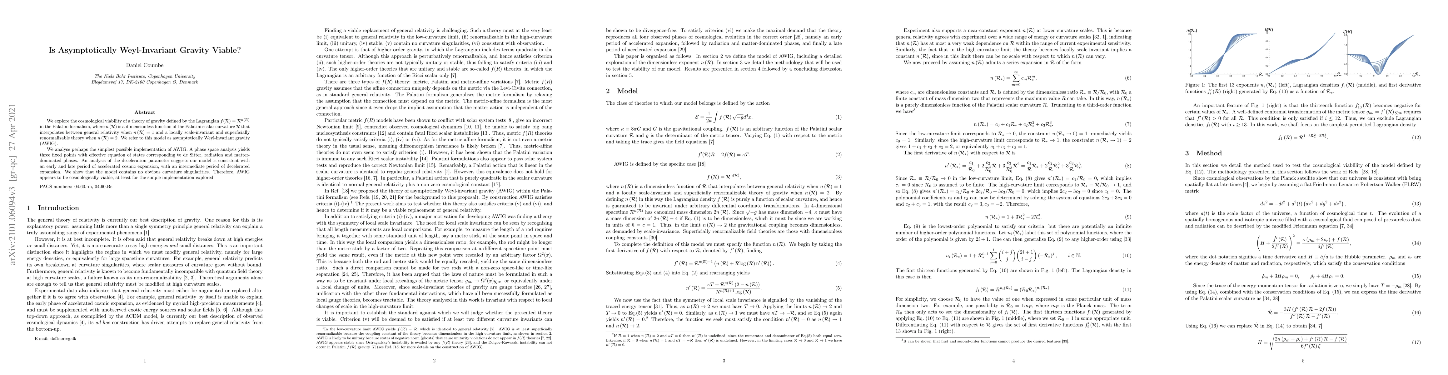 We explore the cosmological viability of a theory of gravity defined by the Lagrangian $f(\mathcal{R})=\mathcal{R}^{n\left(\mathcal{R}\right)}$ in the Palatini formalism, where $n\left(\mathcal{R}\right)$ is a dimensionless function of the Palatini scalar curvature $\mathcal{R}$ that interpolates between general relativity when $n\left(\mathcal{R}\right)=1$ and a locally scale-invariant and superficially renormalizable theory when $n\left(\mathcal{R}\right)=2$. We refer to this model as asymptotically Weyl-invariant gravity (AWIG). We analyse perhaps the simplest possible implementation of AWIG. A phase space analysis yields three fixed points with effective equation of states corresponding to de Sitter, radiation and matter-dominated phases. An analysis of the deceleration parameter suggests our model is consistent with an early and late period of accelerated cosmic expansion, with an intermediate period of decelerated expansion. We show that the model contains no obvious curvature singularities. Therefore, AWIG appears to be cosmologically viable, at least for the simple implementation explored.