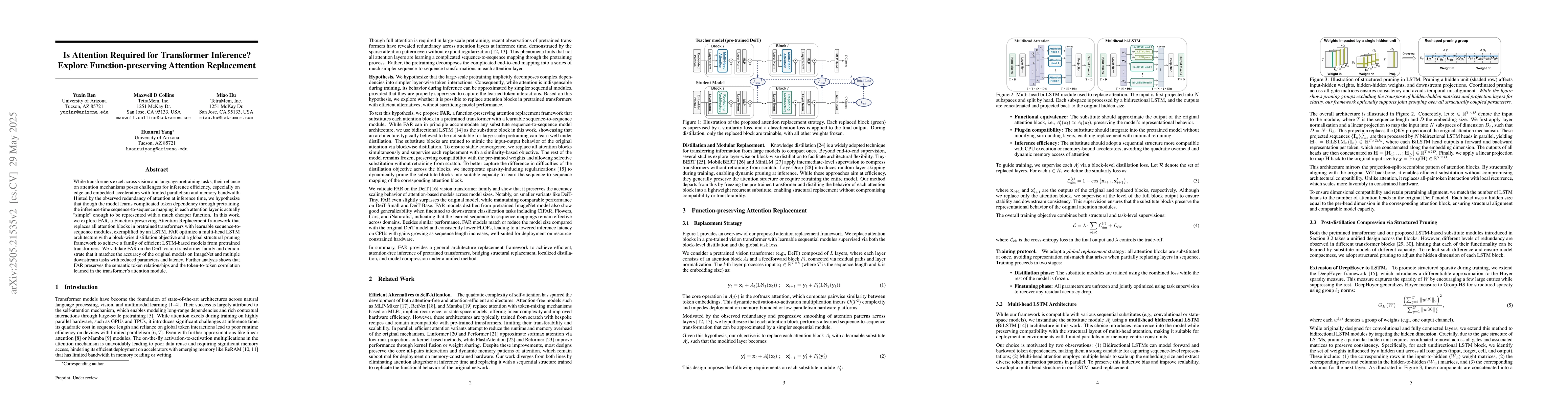 While transformers excel across vision and language pretraining tasks, their reliance on attention mechanisms poses challenges for inference efficiency, especially on edge and embedded accelerators with limited parallelism and memory bandwidth. Hinted by the observed redundancy of attention at inference time, we hypothesize that though the model learns complicated token dependency through pretraining, the inference-time sequence-to-sequence mapping in each attention layer is actually ''simple'' enough to be represented with a much cheaper function. In this work, we explore FAR, a Function-preserving Attention Replacement framework that replaces all attention blocks in pretrained transformers with learnable sequence-to-sequence modules, exemplified by an LSTM. FAR optimize a multi-head LSTM architecture with a block-wise distillation objective and a global structural pruning framework to achieve a family of efficient LSTM-based models from pretrained transformers. We validate FAR on the DeiT vision transformer family and demonstrate that it matches the accuracy of the original models on ImageNet and multiple downstream tasks with reduced parameters and latency. Further analysis shows that FAR preserves the semantic token relationships and the token-to-token correlation learned in the transformer's attention module.