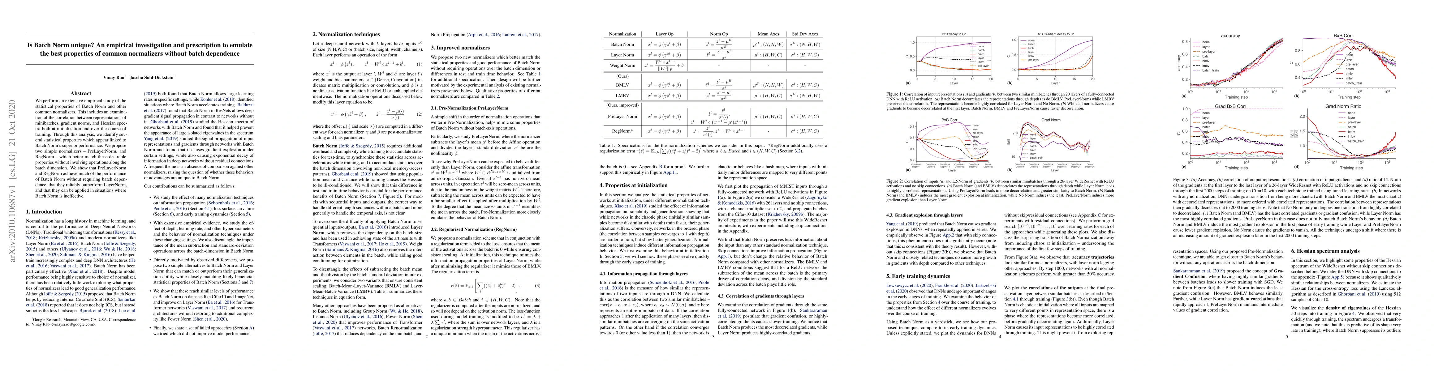 We perform an extensive empirical study of the statistical properties of Batch Norm and other common normalizers. This includes an examination of the correlation between representations of minibatches, gradient norms, and Hessian spectra both at initialization and over the course of training. Through this analysis, we identify several statistical properties which appear linked to Batch Norm's superior performance. We propose two simple normalizers, PreLayerNorm and RegNorm, which better match these desirable properties without involving operations along the batch dimension. We show that PreLayerNorm and RegNorm achieve much of the performance of Batch Norm without requiring batch dependence, that they reliably outperform LayerNorm, and that they can be applied in situations where Batch Norm is ineffective.