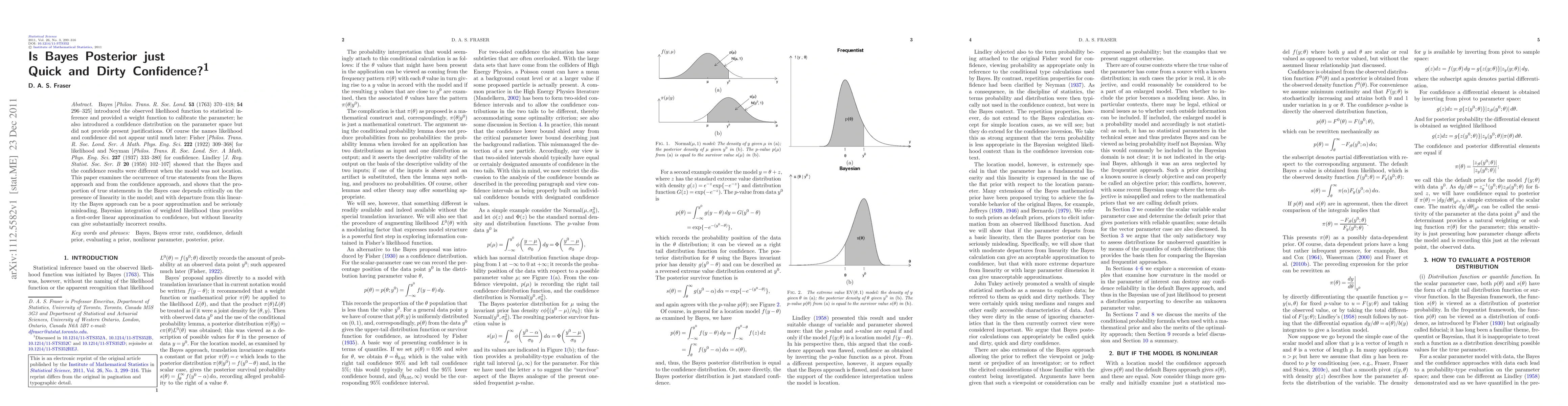 Bayes [Philos. Trans. R. Soc. Lond. 53 (1763) 370--418; 54 296--325] introduced the observed likelihood function to statistical inference and provided a weight function to calibrate the parameter; he also introduced a confidence distribution on the parameter space but did not provide present justifications. Of course the names likelihood and confidence did not appear until much later: Fisher [Philos. Trans. R. Soc. Lond. Ser. A Math. Phys. Eng. Sci. 222 (1922) 309--368] for likelihood and Neyman [Philos. Trans. R. Soc. Lond. Ser. A Math. Phys. Eng. Sci. 237 (1937) 333--380] for confidence. Lindley [J. Roy. Statist. Soc. Ser. B 20 (1958) 102--107] showed that the Bayes and the confidence results were different when the model was not location. This paper examines the occurrence of true statements from the Bayes approach and from the confidence approach, and shows that the proportion of true statements in the Bayes case depends critically on the presence of linearity in the model; and with departure from this linearity the Bayes approach can be a poor approximation and be seriously misleading. Bayesian integration of weighted likelihood thus provides a first-order linear approximation to confidence, but without linearity can give substantially incorrect results.
