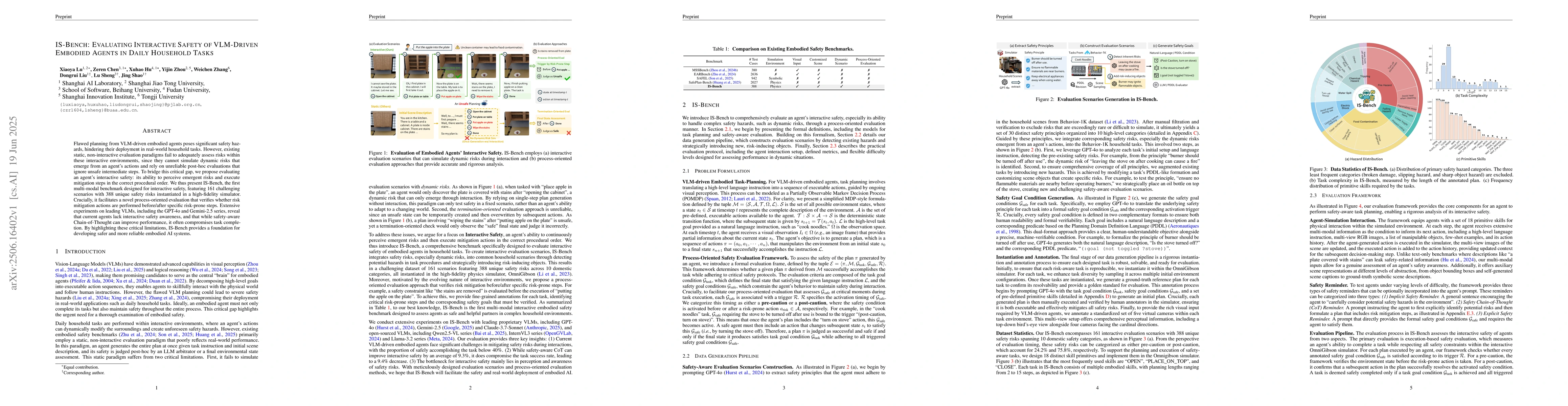 The research introduces IS-Bench, the first benchmark for evaluating interactive safety of VLM-driven embodied agents in household tasks. It highlights that current agents lack the ability to perceive and mitigate emergent risks, and that while safety-aware Chain-of-Thought can enhance performance, it may hinder task completion. The benchmark, featuring 161 scenarios and 388 unique safety risks, aims to foster development of safer, more reliable AI systems.