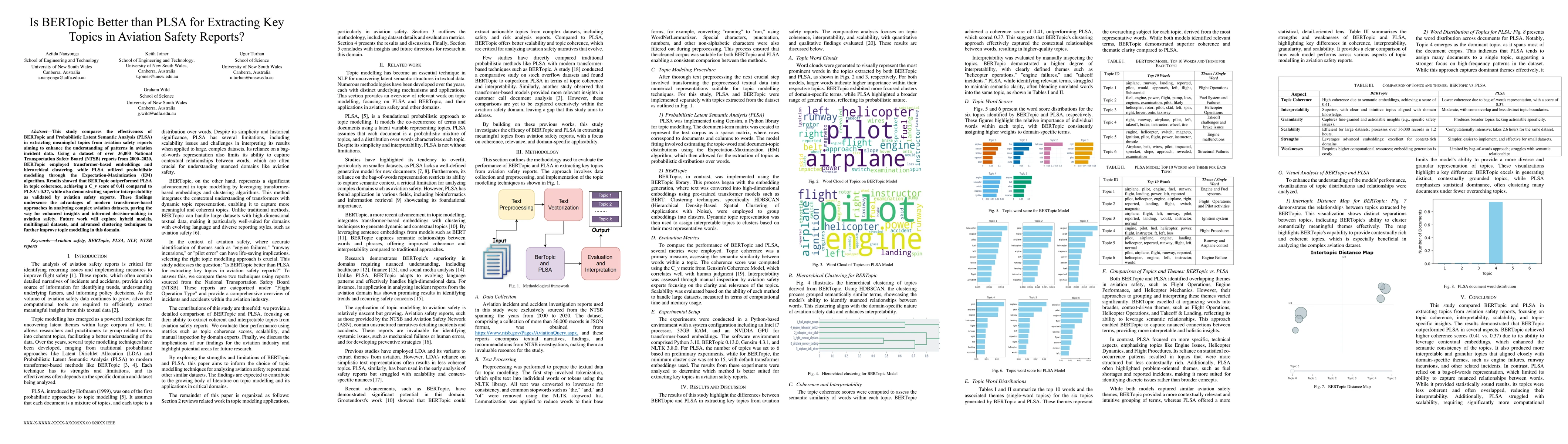 A study comparing BERTopic and PLSA found that BERTopic outperformed PLSA in topic coherence and interpretability for extracting key topics from aviation safety reports. The results suggest modern transformer-based approaches can provide enhanced insights and informed decision-making in aviation safety.