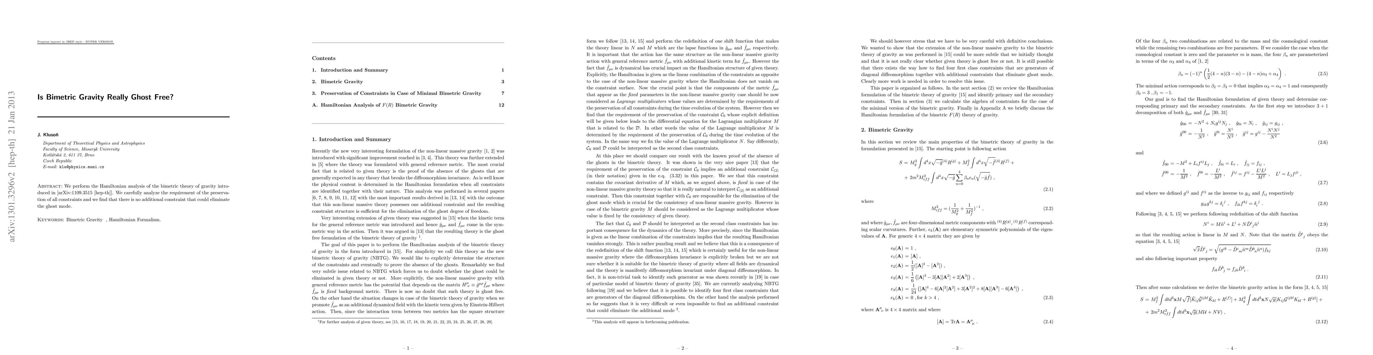 We perform the Hamiltonian analysis of the bimetric theory of gravity introduced in [arXiv:1109.3515 [hep-th]]. We carefully analyze the requirement of the preservation of all constraints and we find that there is no additional constraint that could eliminate the ghost mode.