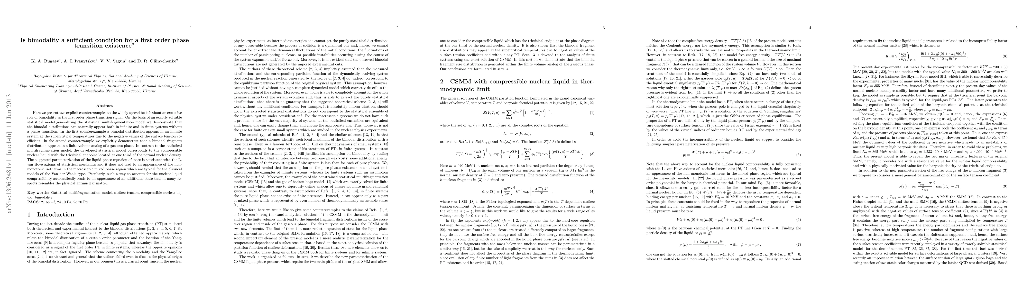Here we present two explicit counterexamples to the widely spread beliefs about an exclusive role of bimodality as the first order phase transition signal. On the basis of an exactly solvable statistical model generalizing the statistical multifragmentation model we demonstrate that the bimodal distributions can naturally appear both in infinite and in finite systems without a phase transition. In the first counterexample a bimodal distribution appears in an infinite system at the supercritical temperatures due to the negative values of the surface tension coefficient. In the second counterexample we explicitly demonstrate that a bimodal fragment distribution appears in a finite volume analog of a gaseous phase. In contrast to the statistical multifragmentation model, the developed statistical model corresponds to the compressible nuclear liquid with the tricritical endpoint located at one third of the normal nuclear density. The suggested parameterization of the liquid phase equation of state is consistent with the L. van Hove axioms of statistical mechanics and it does not lead to an appearance of the non-monotonic isotherms in the macroscopic mixed phase region which are typical for the classical models of the Van der Waals type. Peculiarly, such a way to account for the nuclear liquid compressibility automatically leads to an appearance of an additional state that in many respects resembles the physical antinuclear matter.