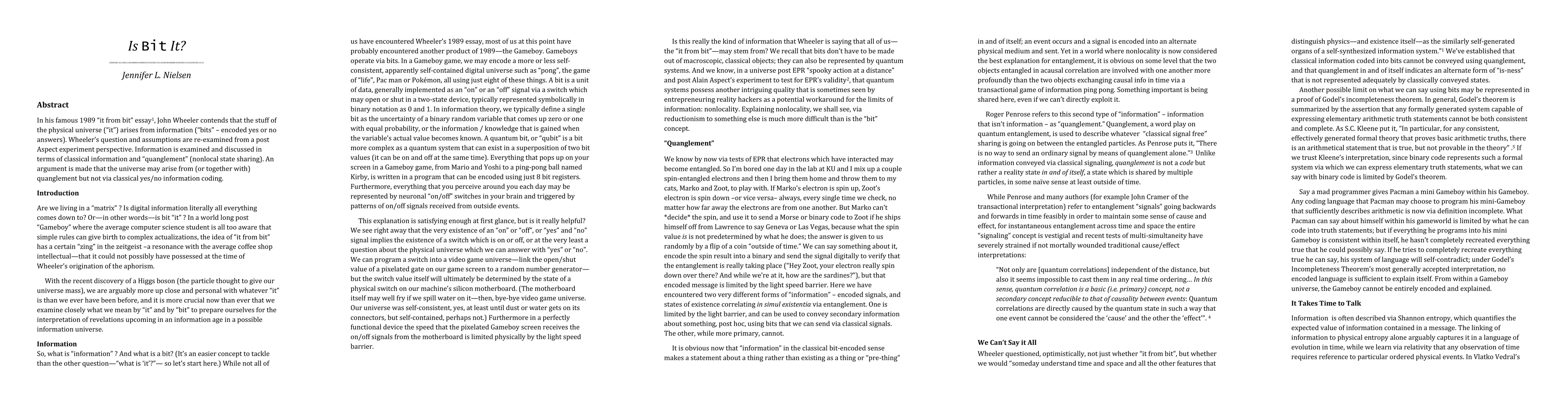 In his famous 1989 It from Bit essay, John Wheeler contends that the stuff of the physical universe, or it, arises from information or bits, encoded in yes or no answers. Wheeler's question and assumptions are reexamined from a post Aspect experiment perspective. Information is examined and discussed in terms of classical information and quantum entanglement, or non local state sharing. An argument is made that the universe may arise from or together with quantum entanglement but not via classical yes and no information sharing.