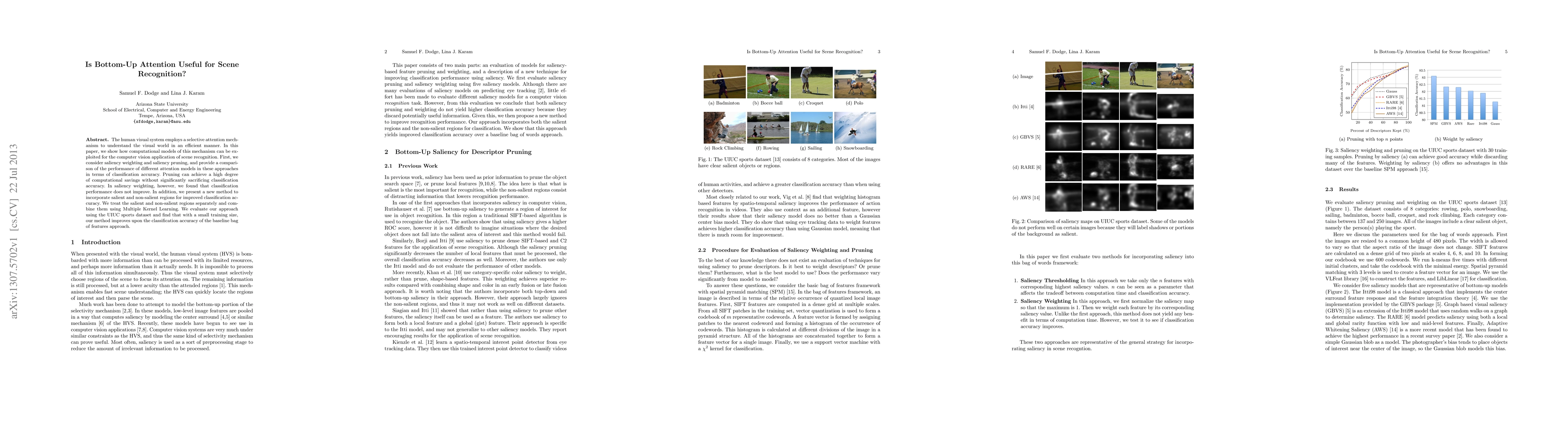 The human visual system employs a selective attention mechanism to understand the visual world in an eficient manner. In this paper, we show how computational models of this mechanism can be exploited for the computer vision application of scene recognition. First, we consider saliency weighting and saliency pruning, and provide a comparison of the performance of different attention models in these approaches in terms of classification accuracy. Pruning can achieve a high degree of computational savings without significantly sacrificing classification accuracy. In saliency weighting, however, we found that classification performance does not improve. In addition, we present a new method to incorporate salient and non-salient regions for improved classification accuracy. We treat the salient and non-salient regions separately and combine them using Multiple Kernel Learning. We evaluate our approach using the UIUC sports dataset and find that with a small training size, our method improves upon the classification accuracy of the baseline bag of features approach.