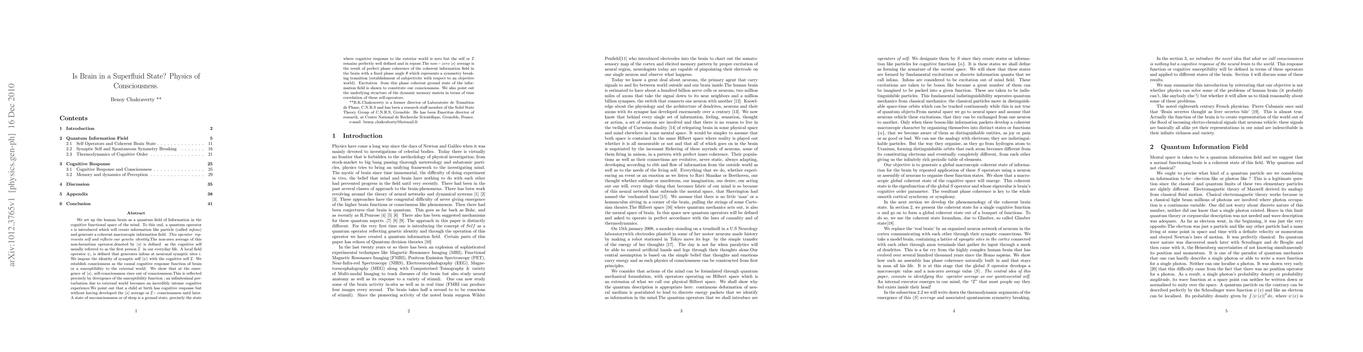 The paper proposes that consciousness arises from a coherent, ordered state akin to superfluidity, where self-awareness emerges as a cognitive order parameter through a thermodynamic phase transition in the brain's neural connectivity. This transition is facilitated by a non-Hermitian operator creating information-like particles in an abstract Hilbert space.