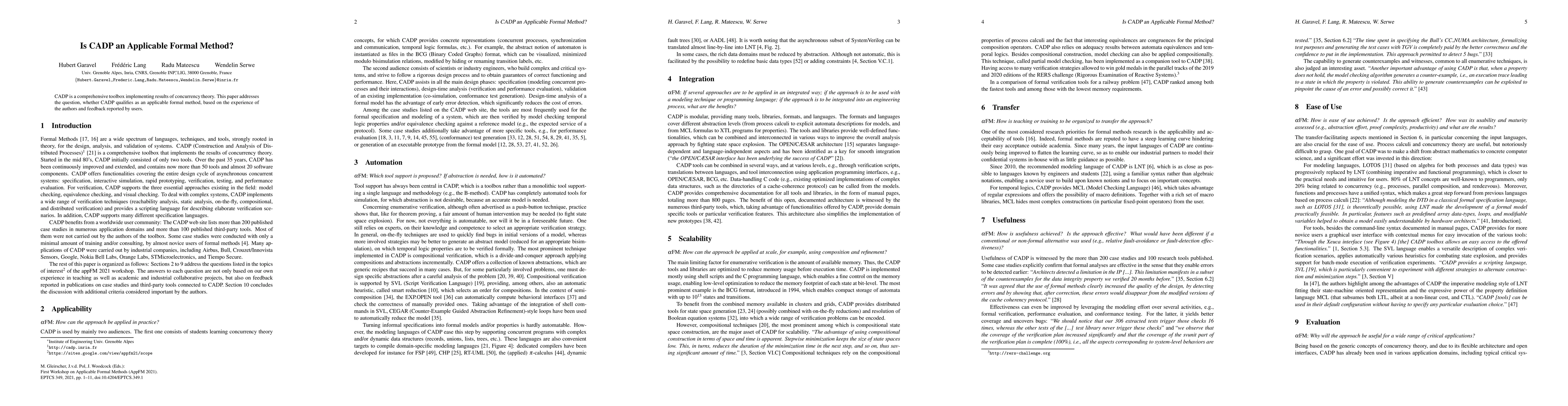 CADP is a comprehensive toolbox implementing results of concurrency theory. This paper addresses the question, whether CADP qualifies as an applicable formal method, based on the experience of the authors and feedback reported by users.