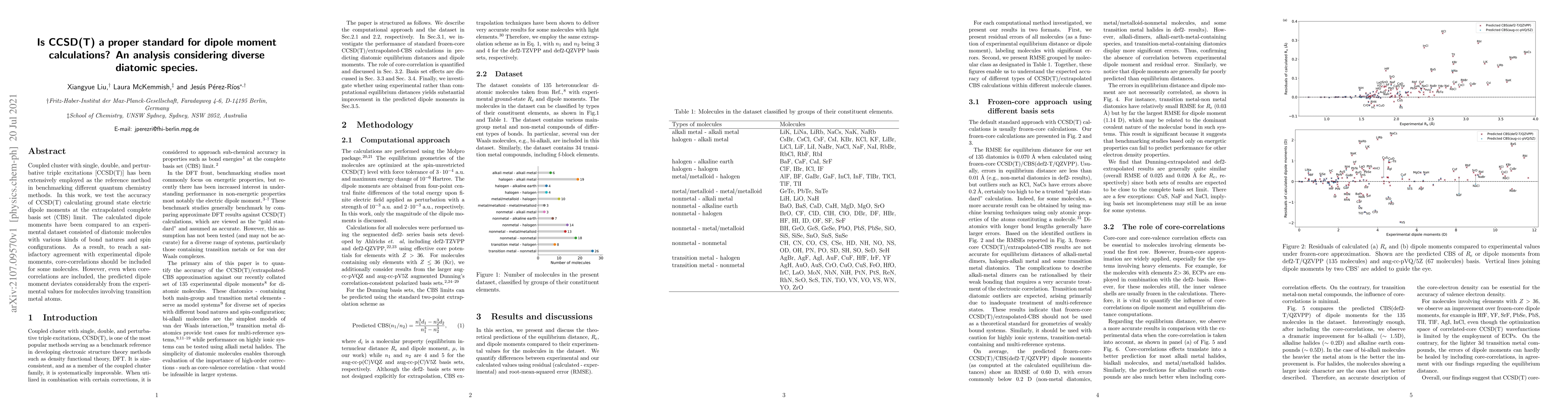 Coupled cluster with single, double, and perturbative triple excitations [CCSD(T)] has been extensively employed as the reference method in benchmarking different quantum chemistry methods. In this work, we test the accuracy of CCSD(T) calculating ground state electric dipole moments at the extrapolated complete basis set (CBS) limit. The calculated dipole moments have been compared to an experimental dataset consisted of diatomic molecules with various kinds of bond natures and spin configurations. As a result, to reach a satisfactory agreement with experimental dipole moments, core-correlations should be included for some molecules. However, even when core-correlations are included, the predicted dipole moment deviates considerably from the experimental values for molecules involving transition metal atoms.