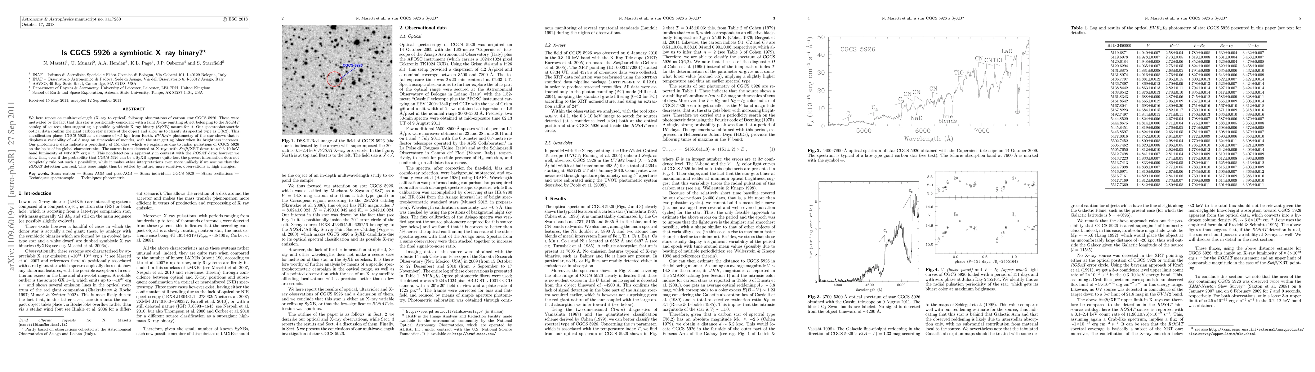 We here report on multiwavelength (X-ray to optical) followup observations of carbon star CGCS 5926. These were motivated by the fact that this star is positionally coincident with a faint X-ray emitting object belonging to the ROSAT catalog of sources, thus suggesting a possible symbiotic X-ray binary (SyXB) nature for it. Our spectrophotometric optical data confirm the giant carbon star nature of the object and allow us to classify its spectral type as C(6,2). This classification places CGCS 5926 at a distance of about 5 kpc from Earth. BVRcIc photometry of the star shows that it displays a variability of about 0.3 mag on timescales of months, with the star getting bluer when its brightness increases. Our photometric data indicate a periodicity of 151 days, which we explain as due to radial pulsations of CGCS 5926 on the basis of its global characteristics. The source is not detected at X-rays with Swift/XRT down to a 0.3-10 keV band luminosity of around 3e32 erg/s. This nondetection is apparently in contrast with the ROSAT data; however we show that, even if the probability that CGCS 5926 can be a SyXB appears quite low, the present information does not completely rule out such a possibility, while it makes other interpretations even more unlikely if we assume that the ROSAT detection was real. This issue might thus be settled by future, more sensitive, observations at high energies.