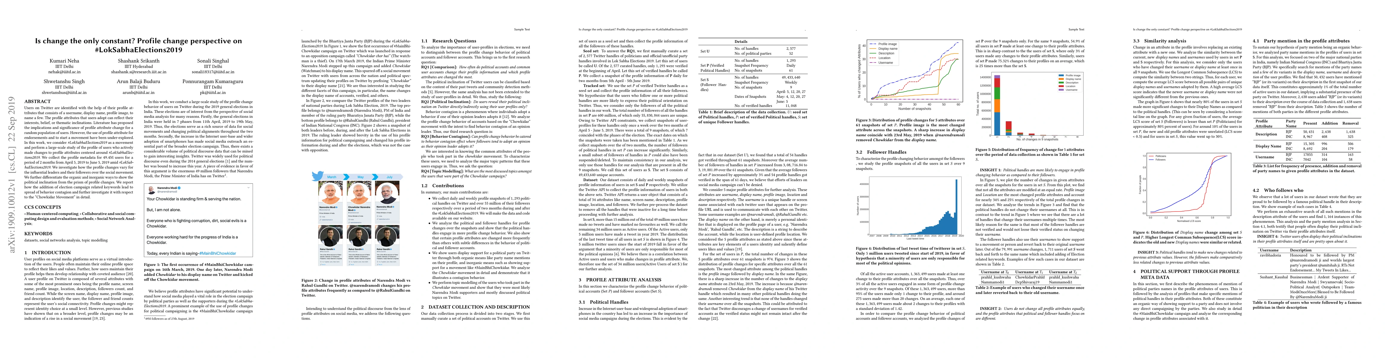 A study analyzed 49.4M Twitter users' profile changes during #LokSabhaElections2019 to understand how influential leaders and their followers adapted their profiles. The research found that addition of election campaign-related keywords led to the spread of behavior contagion.