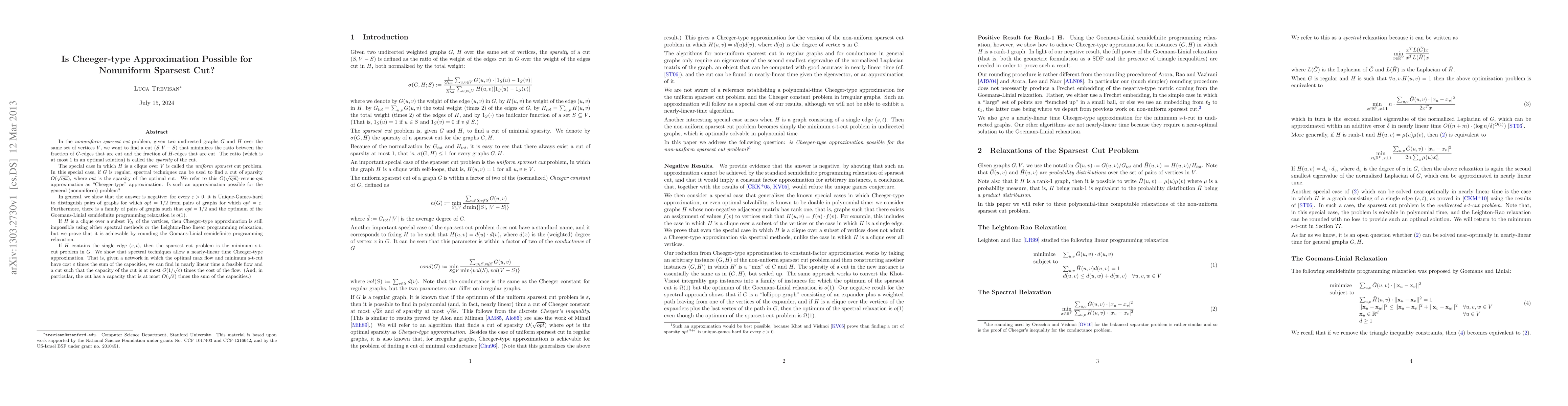 In the {\em nonuniform sparsest cut} problem, given two undirected graphs $G$ and $H$ over the same set of vertices $V$, we want to find a cut $(S,V-S)$ that minimizes the ratio between the fraction of $G$-edges that are cut and the fraction of $H$-edges that are cut. The ratio (which is at most 1 in an optimal solution) is called the {\em sparsity} of the cut. In the {\em uniform sparsest cut} problem, $H$ is a clique over $V$. If $G$ is regular, it is possible to find a solution to the uniform sparsest cut of cost $O(\sqrt{opt})$ in nearly linear time. Is such an approximation, which we call "Cheege-type" approximation, achievable in the non-uniform case? We show that the answer is negative, assuming the Unique Games Conjecture, for general H. Furthermore, the Leighton-Rao linear programming relaxation and the spectral relaxation fail to find such an approximation even if $H$ is a clique over a subset of vertices. Using semidefinite programming, however, we can find Cheeger-type approximations in polynomial time whenever the adjacency matrix of $H$ has rank 1. (This includes the cases in which $H$ is a clique over a subset of vertices.)