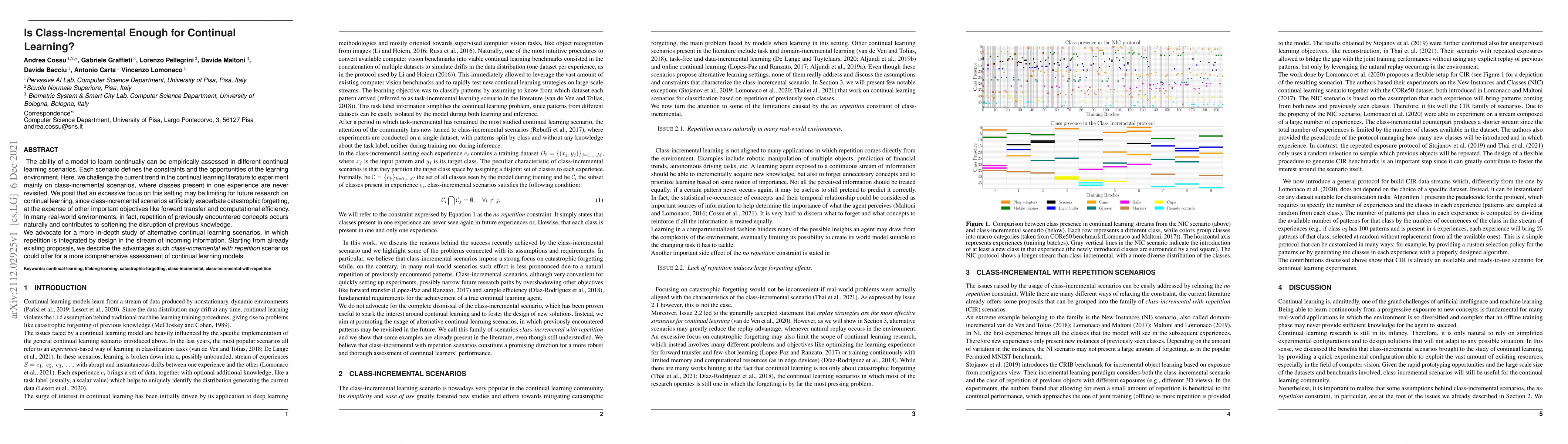This paper critiques the prevalent focus on class-incremental continual learning scenarios, arguing that they artificially intensify catastrophic forgetting and neglect other vital objectives like forward transfer and computational efficiency. It advocates for exploring alternative continual learning scenarios with inherent repetition to achieve a more comprehensive evaluation of continual learning models.