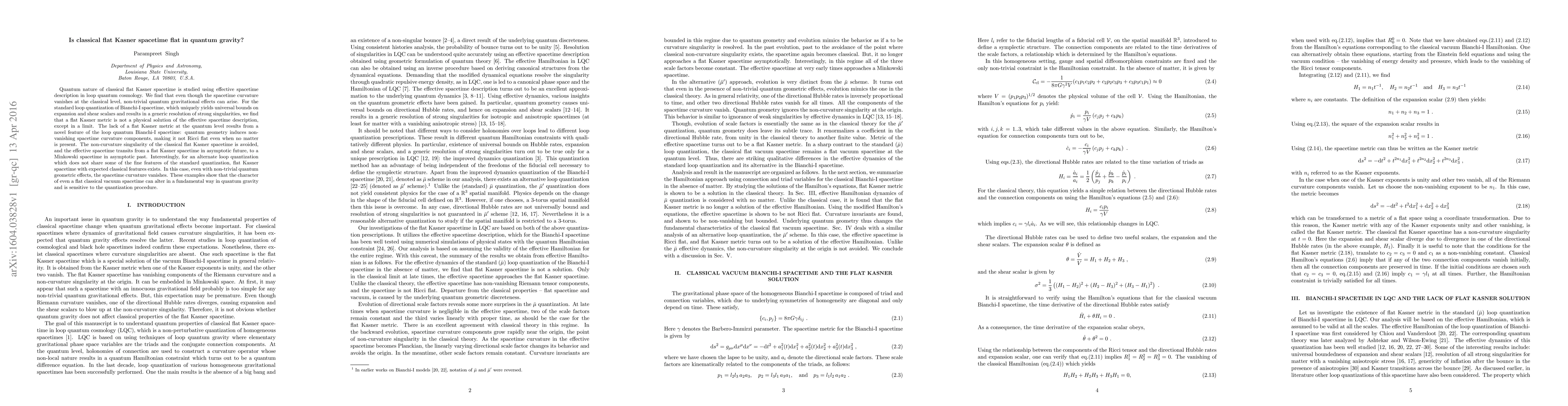 This research investigates the quantum nature of classical flat Kasner spacetime within loop quantum cosmology, revealing that quantum gravitational effects can induce non-vanishing curvature components, making it non-Ricci flat. It concludes that standard loop quantization resolves singularities and avoids the classical flat Kasner metric, while an alternate quantization maintains classical features despite quantum geometry.