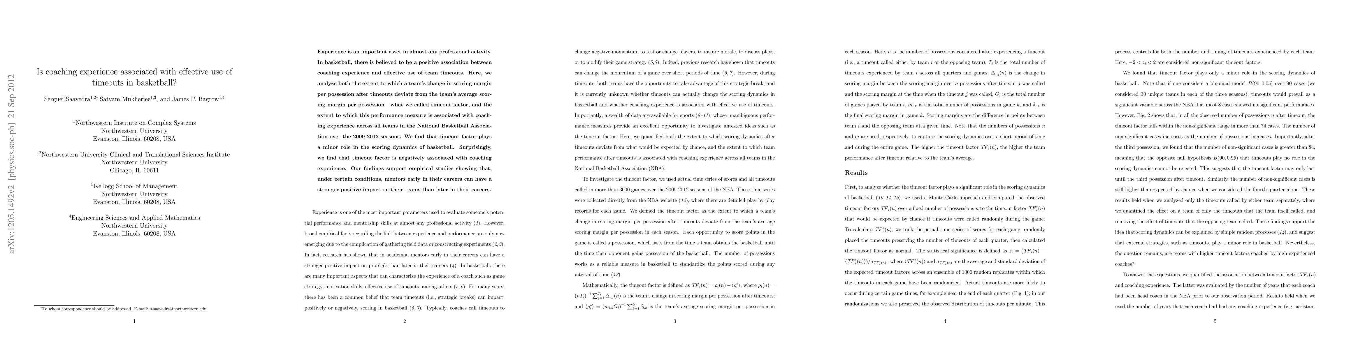 This study investigates the relationship between coaching experience and the effectiveness of timeouts in basketball, finding that the "timeout factor" is negatively associated with coaching experience, suggesting that less experienced coaches may be more effective in utilizing timeouts.