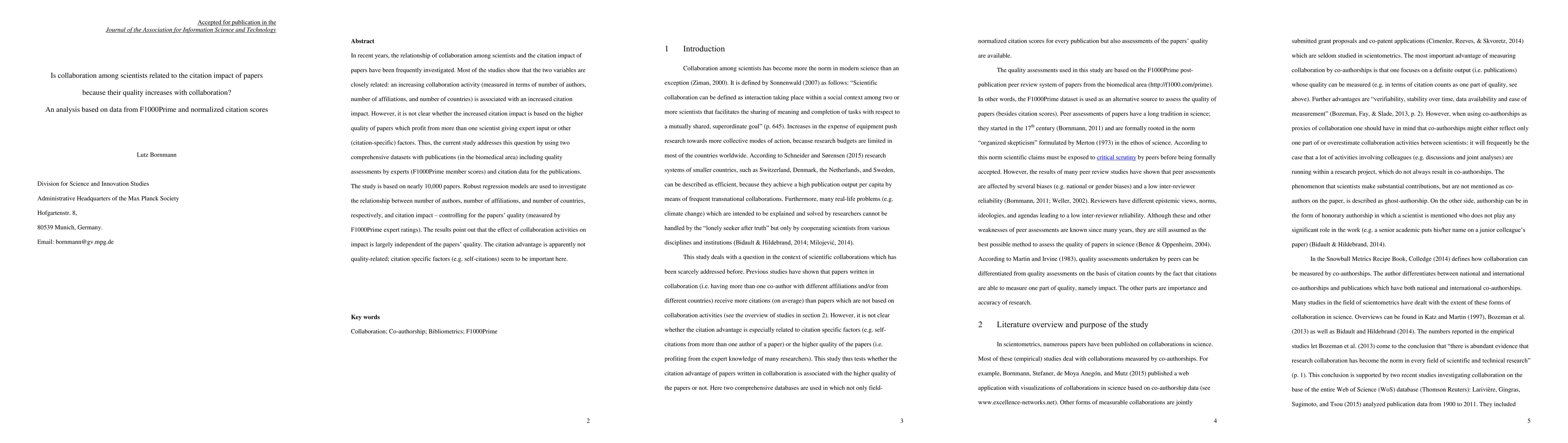 This study investigates whether increased collaboration among scientists leads to higher citation impact due to improved paper quality or other factors. Using data from nearly 10,000 biomedical papers and expert quality assessments, it finds that collaboration's effect on citation impact is largely independent of paper quality, suggesting citation-specific factors play a significant role.