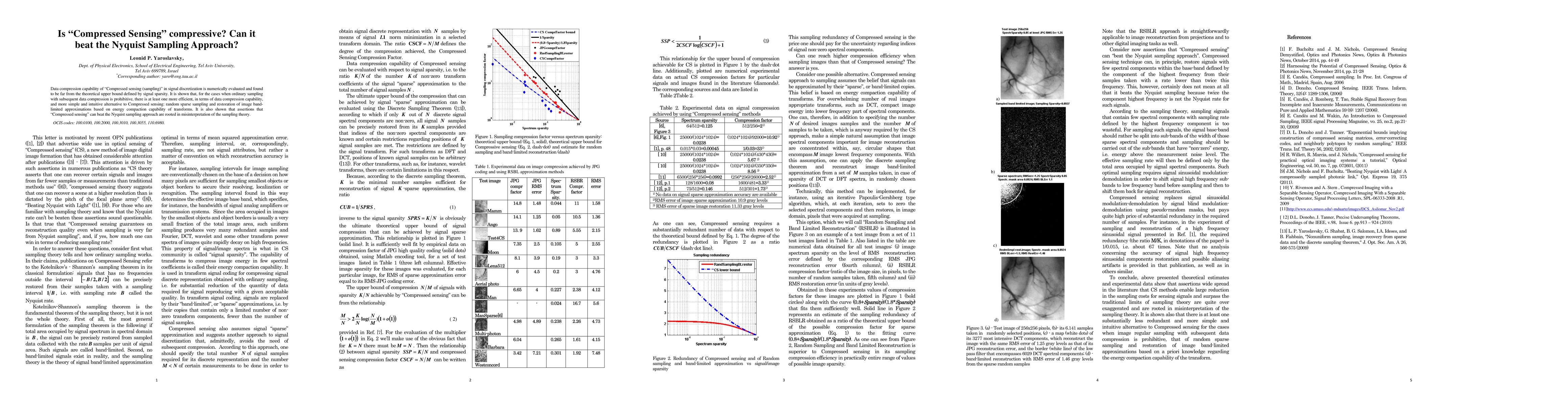 Summary: This paper evaluates the data compression efficiency of Compressed Sensing and finds it falls short of theoretical expectations based on signal sparsity. It concludes that random sparse sampling with transform-based restoration offers a more efficient alternative and debunks claims that Compressed Sensing can outperform the Nyquist sampling method.