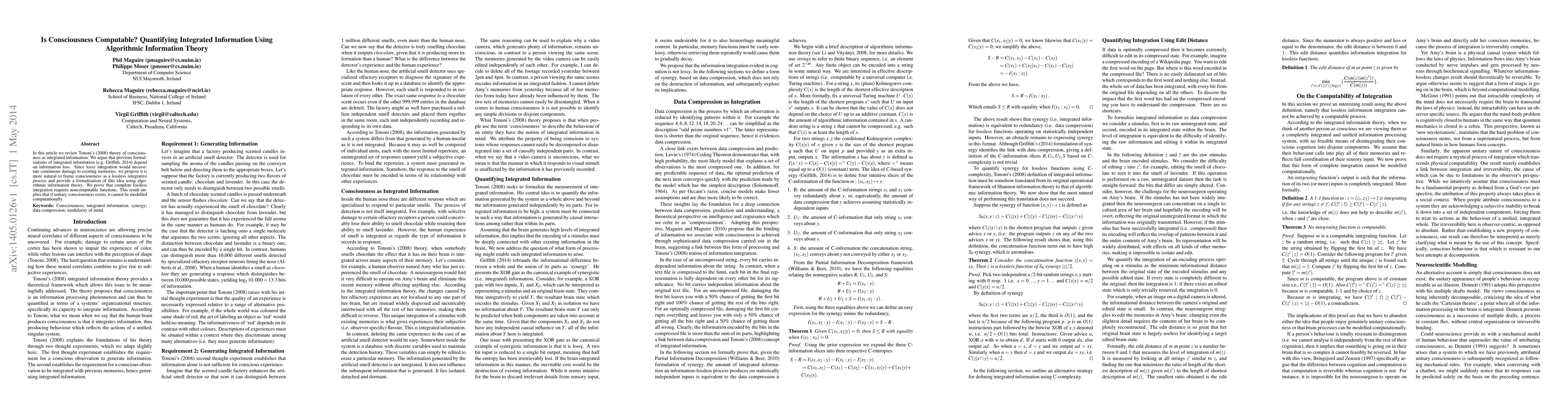 In this article we review Tononi's (2008) theory of consciousness as integrated information. We argue that previous formalizations of integrated information (e.g. Griffith, 2014) depend on information loss. Since lossy integration would necessitate continuous damage to existing memories, we propose it is more natural to frame consciousness as a lossless integrative process and provide a formalization of this idea using algorithmic information theory. We prove that complete lossless integration requires noncomputable functions. This result implies that if unitary consciousness exists, it cannot be modelled computationally.
