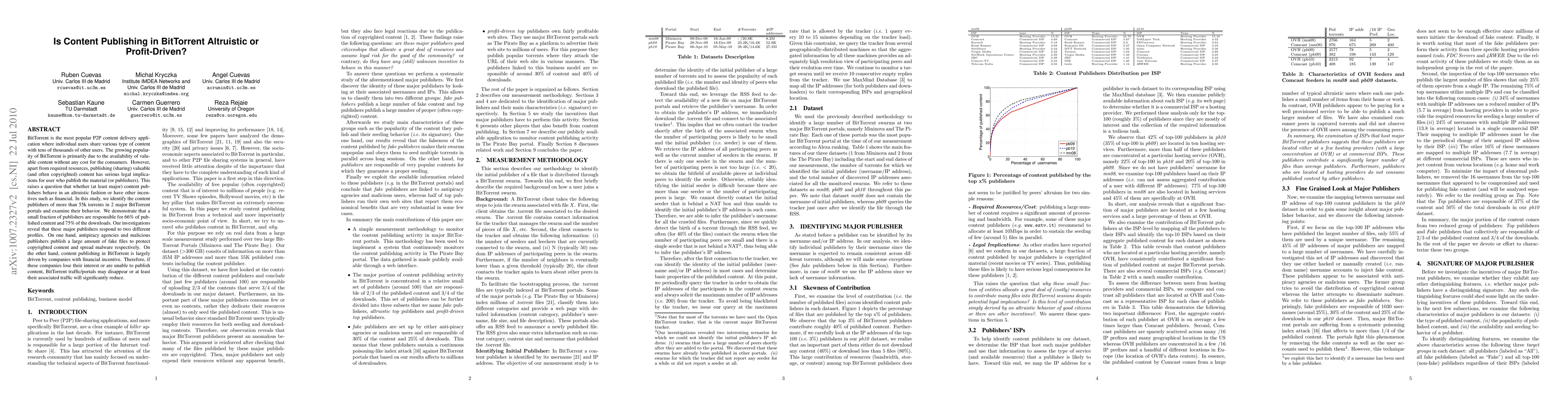 This study investigates whether major publishers on BitTorrent act altruistically or are profit-driven. It finds that a small fraction of publishers account for the majority of content and downloads, revealing that while some publish to protect copyrighted material, the majority are companies motivated by financial incentives.