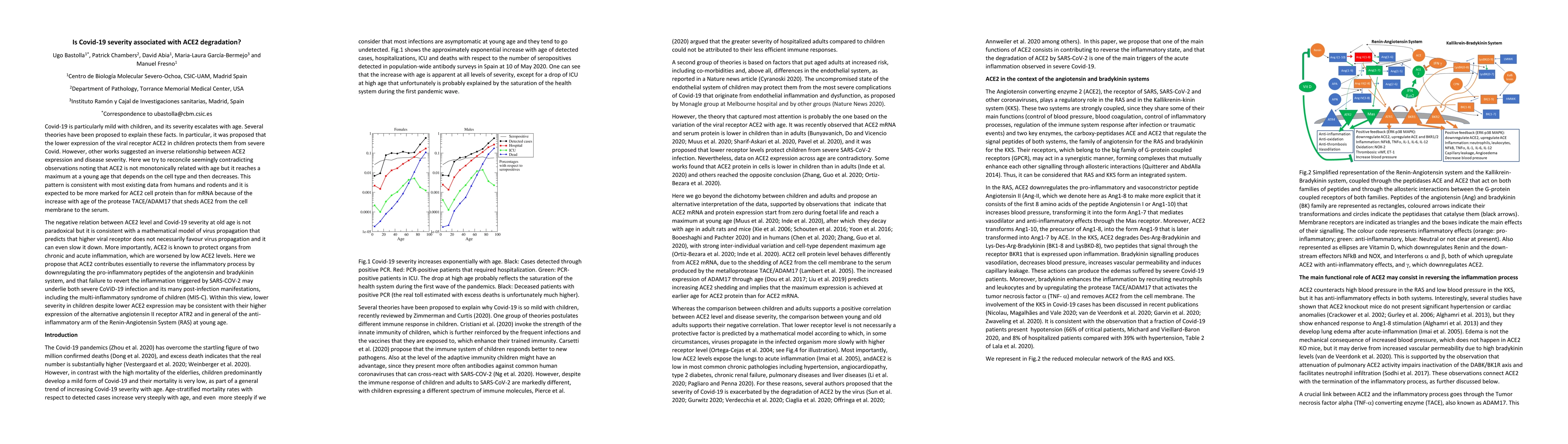 Covid-19 is particularly mild with children, and its severity escalates with age. Several theories have been proposed to explain these facts. In particular, it was proposed that the lower expression of the viral receptor ACE2 in children protects them from severe Covid. However, other works suggested an inverse relationship between ACE2 expression and disease severity. Here we try to reconcile seemingly contradicting observations noting that ACE2 is not monotonically related with age but it reaches a maximum at a young age that depends on the cell type and then decreases. This pattern is consistent with most existing data from humans and rodents and it is expected to be more marked for ACE2 cell protein than for mRNA because of the increase with age of the protease TACE/ADAM17 that sheds ACE2 from the cell membrane to the serum. The negative relation between ACE2 level and Covid-19 severity at old age is not paradoxical but it is consistent with a mathematical model of virus propagation that predicts that higher viral receptor does not necessarily favour virus propagation and it can even slow it down. More importantly, ACE2 is known to protect organs from chronic and acute inflammation, which are worsened by low ACE2 levels. Here we propose that ACE2 contributes essentially to reverse the inflammatory process by downregulating the pro-inflammatory peptides of the angiotensin and bradykinin system, and that failure to revert the inflammation triggered by SARS-COV-2 may underlie both severe CoViD-19 infection and its many post-infection manifestations, including the multi-inflammatory syndrome of children (MIS-C). Within this view, lower severity in children despite lower ACE2 expression may be consistent with their higher expression of the alternative angiotensin II receptor ATR2 and in general of the anti-inflammatory arm of the Renin-Angiotensin System (RAS) at young age.
