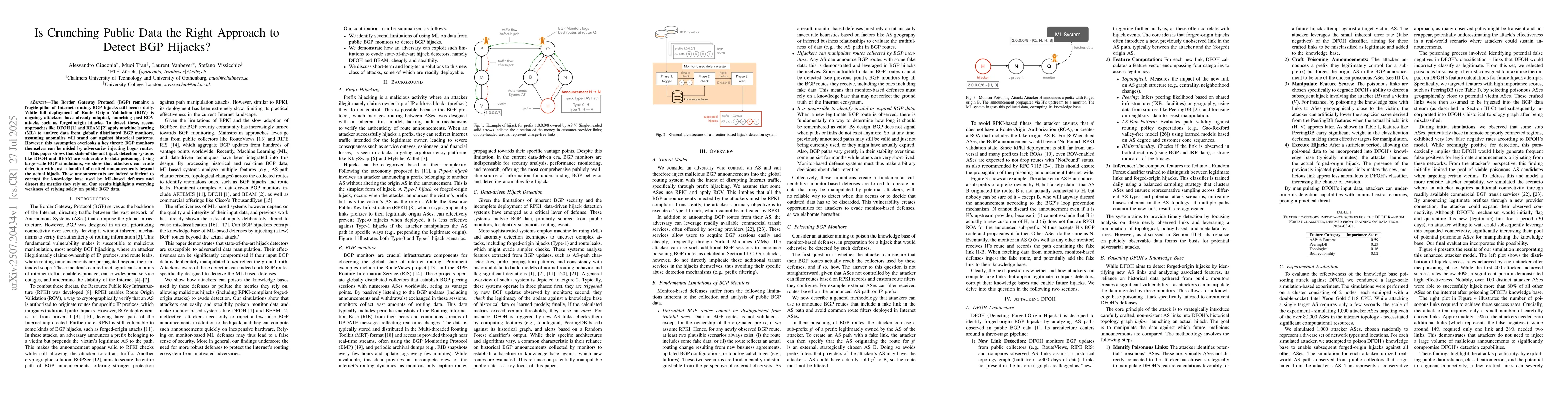 The Border Gateway Protocol (BGP) remains a fragile pillar of Internet routing. BGP hijacks still occurr daily. While full deployment of Route Origin Validation (ROV) is ongoing, attackers have already adapted, launching post-ROV attacks such as forged-origin hijacks. To detect these, recent approaches like DFOH [Holterbach et al., USENIX NSDI '24] and BEAM [Chen et al., USENIX Security '24] apply machine learning (ML) to analyze data from globally distributed BGP monitors, assuming anomalies will stand out against historical patterns. However, this assumption overlooks a key threat: BGP monitors themselves can be misled by adversaries injecting bogus routes. This paper shows that state-of-the-art hijack detection systems like DFOH and BEAM are vulnerable to data poisoning. Using large-scale BGP simulations, we show that attackers can evade detection with just a handful of crafted announcements beyond the actual hijack. These announcements are indeed sufficient to corrupt the knowledge base used by ML-based defenses and distort the metrics they rely on. Our results highlight a worrying weakness of relying solely on public BGP data.