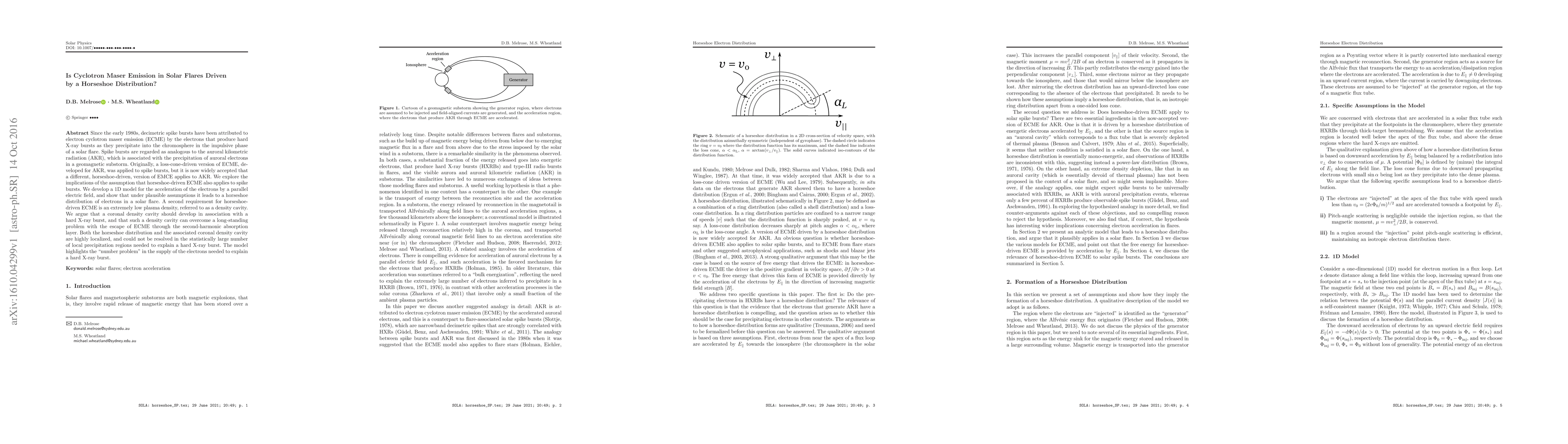 This paper explores whether cyclotron maser emission in solar flares is driven by a horseshoe electron distribution, analogous to auroral kilometric radiation. It develops a 1D model showing that such a distribution could form under certain conditions, and argues that a localized density cavity could resolve the problem of emission escape, though it raises the "number problem" in electron supply for hard X-ray bursts.