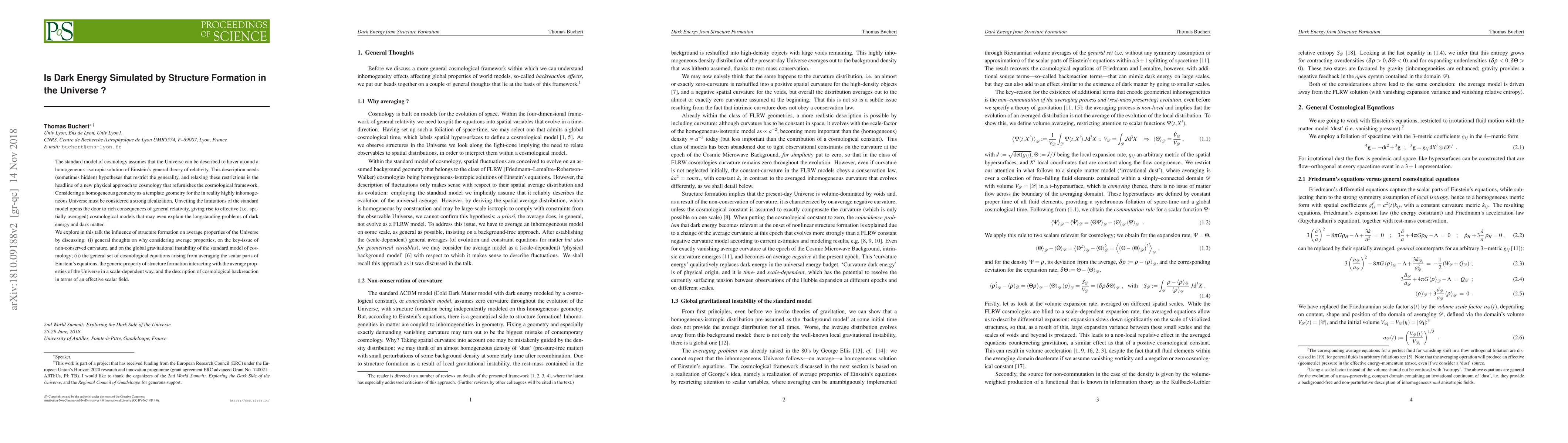 This paper explores whether structure formation in the Universe could simulate dark energy, challenging the standard model of cosmology by averaging the scalar parts of Einstein's equations to describe the influence of inhomogeneous structures on the Universe's overall properties. It proposes an effective scalar field to represent cosmological backreaction, potentially explaining dark energy without invoking it as a separate entity.