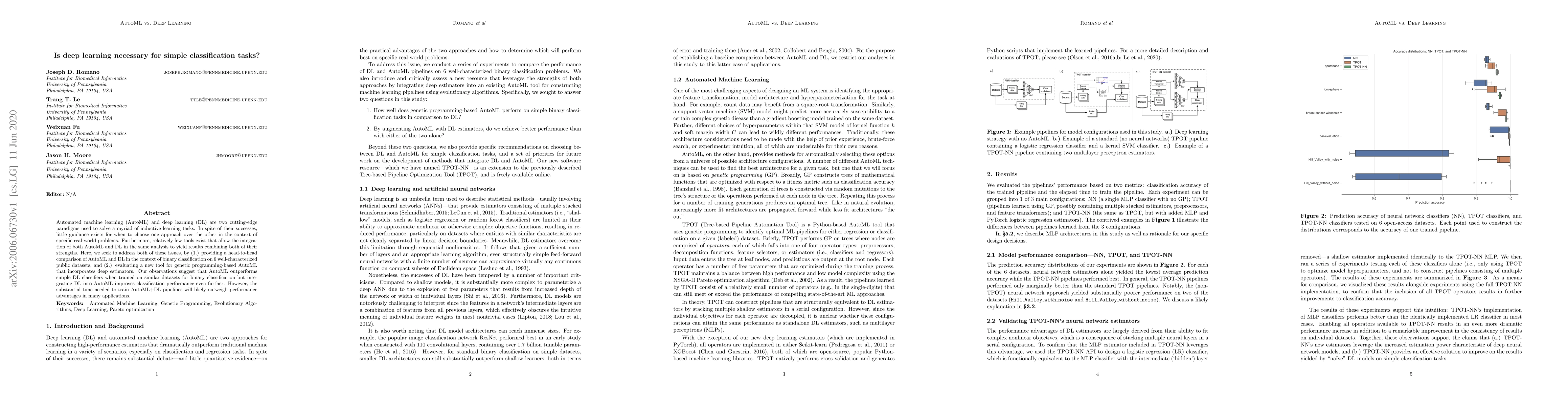 Automated machine learning (AutoML) and deep learning (DL) are two cutting-edge paradigms used to solve a myriad of inductive learning tasks. In spite of their successes, little guidance exists for when to choose one approach over the other in the context of specific real-world problems. Furthermore, relatively few tools exist that allow the integration of both AutoML and DL in the same analysis to yield results combining both of their strengths. Here, we seek to address both of these issues, by (1.) providing a head-to-head comparison of AutoML and DL in the context of binary classification on 6 well-characterized public datasets, and (2.) evaluating a new tool for genetic programming-based AutoML that incorporates deep estimators. Our observations suggest that AutoML outperforms simple DL classifiers when trained on similar datasets for binary classification but integrating DL into AutoML improves classification performance even further. However, the substantial time needed to train AutoML+DL pipelines will likely outweigh performance advantages in many applications.