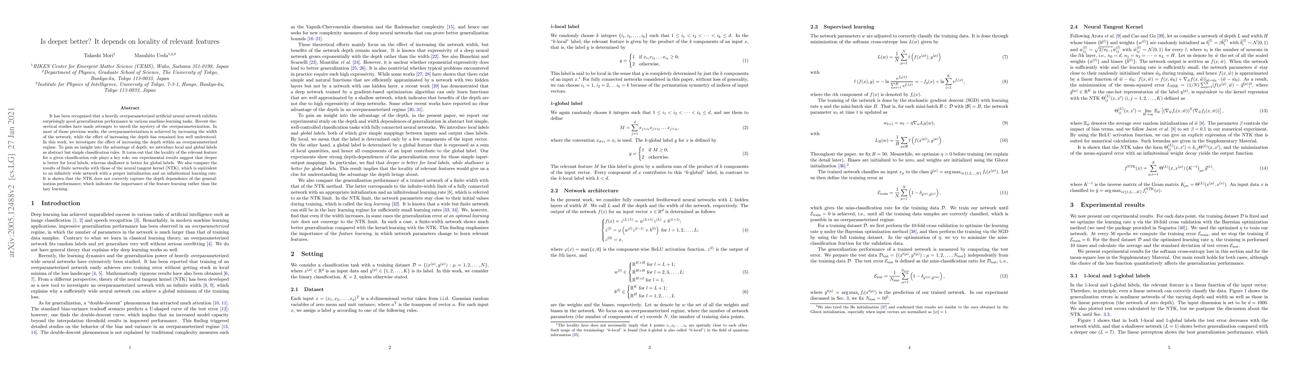 It has been recognized that a heavily overparameterized artificial neural network exhibits surprisingly good generalization performance in various machine-learning tasks. Recent theoretical studies have made attempts to unveil the mystery of the overparameterization. In most of those previous works, the overparameterization is achieved by increasing the width of the network, while the effect of increasing the depth has remained less well understood. In this work, we investigate the effect of increasing the depth within an overparameterized regime. To gain an insight into the advantage of depth, we introduce local and global labels as abstract but simple classification rules. It turns out that the locality of the relevant feature for a given classification rule plays a key role; our experimental results suggest that deeper is better for local labels, whereas shallower is better for global labels. We also compare the results of finite networks with those of the neural tangent kernel (NTK), which is equivalent to an infinitely wide network with a proper initialization and an infinitesimal learning rate. It is shown that the NTK does not correctly capture the depth dependence of the generalization performance, which indicates the importance of the feature learning rather than the lazy learning.