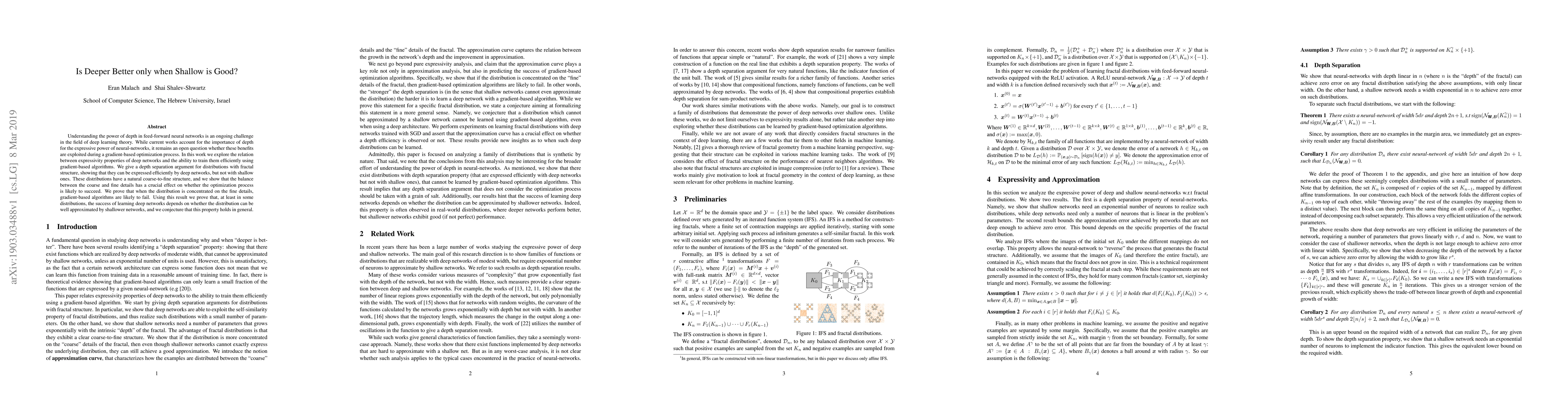 Understanding the power of depth in feed-forward neural networks is an ongoing challenge in the field of deep learning theory. While current works account for the importance of depth for the expressive power of neural-networks, it remains an open question whether these benefits are exploited during a gradient-based optimization process. In this work we explore the relation between expressivity properties of deep networks and the ability to train them efficiently using gradient-based algorithms. We give a depth separation argument for distributions with fractal structure, showing that they can be expressed efficiently by deep networks, but not with shallow ones. These distributions have a natural coarse-to-fine structure, and we show that the balance between the coarse and fine details has a crucial effect on whether the optimization process is likely to succeed. We prove that when the distribution is concentrated on the fine details, gradient-based algorithms are likely to fail. Using this result we prove that, at least in some distributions, the success of learning deep networks depends on whether the distribution can be well approximated by shallower networks, and we conjecture that this property holds in general.