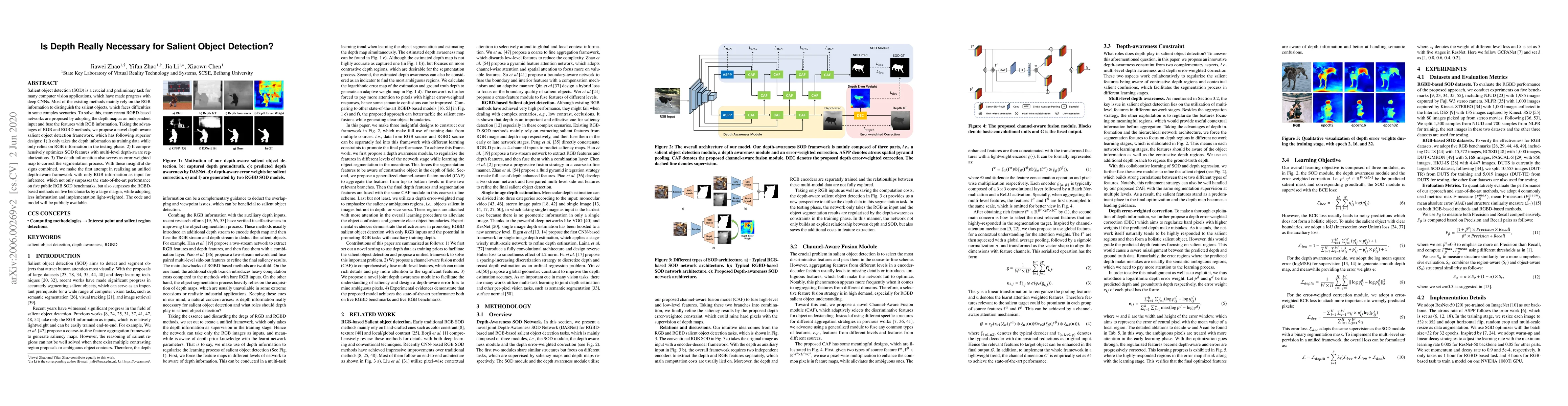 This paper proposes a novel depth-aware salient object detection framework that leverages depth information only during training, achieving superior performance using only RGB input during inference, outperforming both RGB and RGBD-based methods on multiple benchmarks.