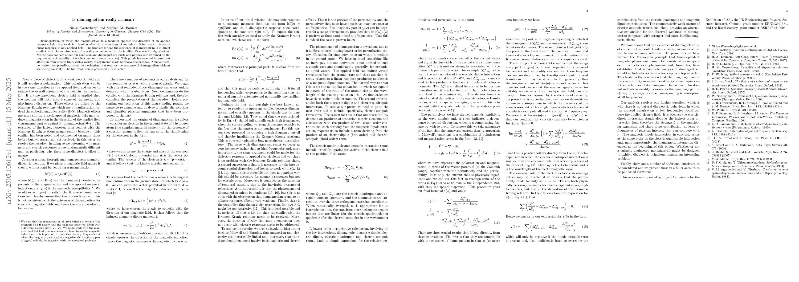 The paper presents a resolution to the paradox of diamagnetism's existence conflicting with causality requirements, utilizing Kramers-Kronig relations.