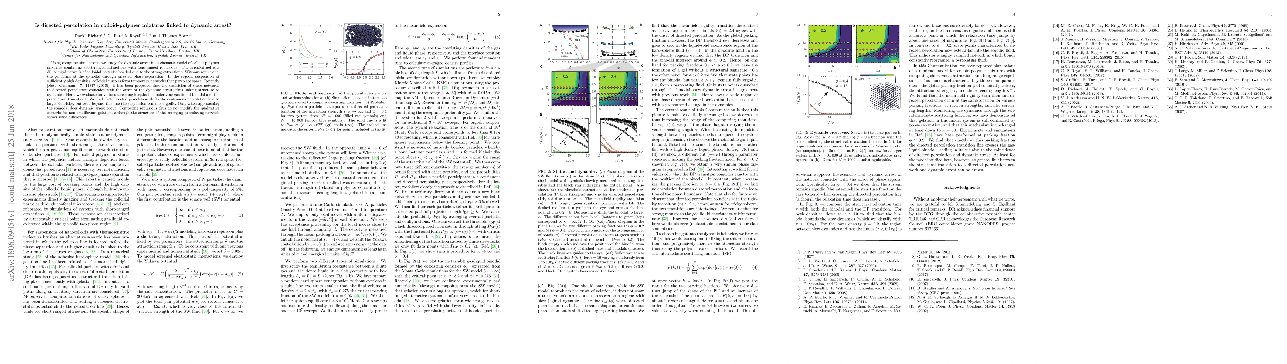 Using computer simulations, we study the dynamic arrest in a schematic model of colloid-polymer mixtures combining short-ranged attractions with long-ranged repulsions. The arrested gel is a dilute rigid network of colloidal particles bonded due to the strong attractions. Without repulsions, the gel forms at the spinodal through arrested phase separation. In the ergodic suspension at sufficiently high densities, colloidal clusters form temporary networks that percolate space. Recently [Nat. Commun. 7, 11817 (2016)], it has been proposed that the transition of these networks to directed percolation coincides with the onset of the dynamic arrest, thus linking structure to dynamics. Here, we evaluate for various screening lengths the underlying gas-liquid binodal and the percolation transitions. We find that directed percolation shifts the continuous percolation line to larger densities, but even beyond this line the suspension remains ergodic. Only when approaching the spinodal does dynamic arrest occur. Competing repulsions thus do not modify the qualitative scenario for non-equilibrium gelation, although the structure of the emerging percolating network shows some differences.