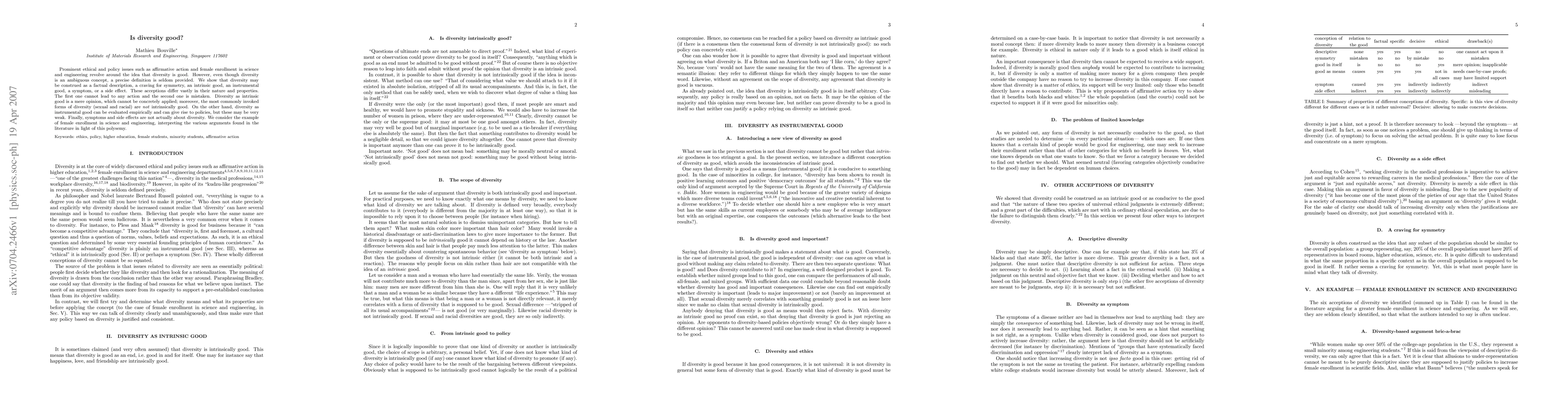 Prominent ethical and policy issues such as affirmative action and female enrollment in science and engineering revolve around the idea that diversity is good. However, even though diversity is an ambiguous concept, a precise definition is seldom provided. We show that diversity may be construed as a factual description, a craving for symmetry, an intrinsic good, an instrumental good, a symptom, or a side effect. These acceptions differ vastly in their nature and properties. The first one cannot lead to any action and the second one is mistaken. Diversity as intrinsic good is a mere opinion, which cannot be concretely applied; moreover, the most commonly invoked forms of diversity (sexual and racial) are not intrinsically good. On the other hand, diversity as instrumental good can be evaluated empirically and can give rise to policies, but these may be very weak. Finally, symptoms and side effects are not actually about diversity. We consider the example of female enrollment in science and engineering, interpreting the various arguments found in the literature in light of this polysemy. Keywords: ethics, policy, higher education, female students, minority students, affirmative action