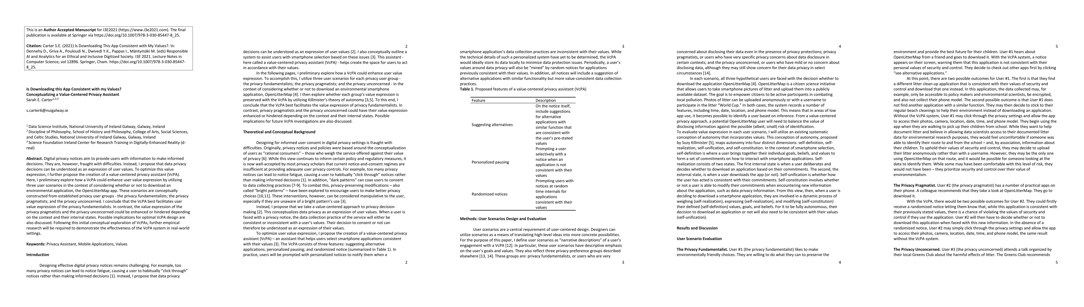 Digital privacy notices aim to provide users with information to make informed decisions. They are, however, fraught with difficulties. Instead, I propose that data privacy decisions can be understood as an expression of user values. To optimize this value expression, I further propose the creation of a value-centered privacy assistant (VcPA). Here, I preliminary explore how a VcPA could enhance user value expression by utilizing three user scenarios in the context of considering whether or not to download an environmental application, the OpenLitterMap app. These scenarios are conceptually constructed from established privacy user groups - the privacy fundamentalists; the privacy pragmatists; and the privacy unconcerned. I conclude that the VcPA best facilitates user value expression of the privacy fundamentalists. In contrast, the value expression of the privacy pragmatists and the privacy unconcerned could be enhanced or hindered depending on the context and their internal states. Possible implications for optimal VcPA design are also discussed. Following this initial conceptual exploration of VcPAs, further empirical research will be required to demonstrate the effectiveness of the VcPA system in real-world settings.