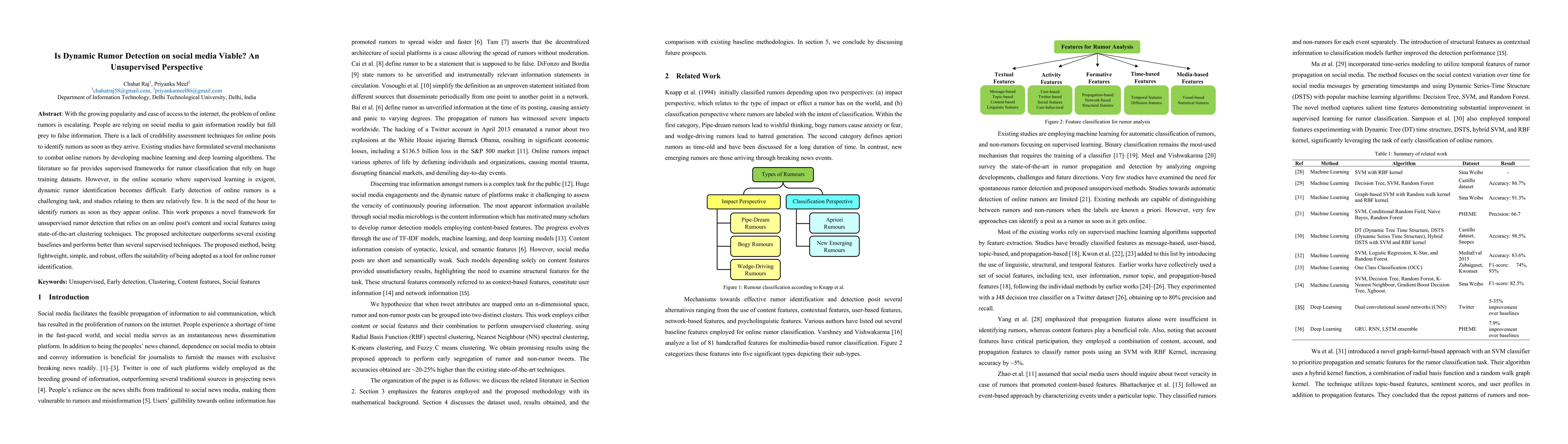 This paper proposes an unsupervised framework for dynamic rumor detection on social media, leveraging content and social features with clustering techniques. The method outperforms existing baselines and supervised techniques, offering a lightweight and robust solution for early online rumor identification.