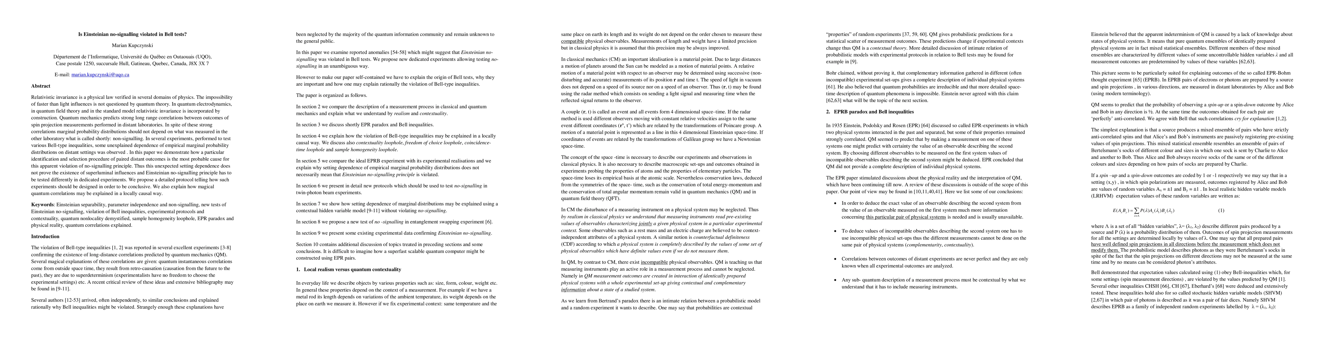 Relativistic invariance is a physical law verified in several domains of physics. The impossibility of faster than light influences is not questioned by quantum theory. In quantum electrodynamics, in quantum field theory and in the standard model relativistic invariance is incorporated by construction. Quantum mechanics predicts strong long range correlations between outcomes of spin projection measurements performed in distant laboratories. In spite of these strong correlations marginal probability distributions should not depend on what was measured in the other laboratory what is called shortly: non-signalling. In several experiments, performed to test various Bell-type inequalities, some unexplained dependence of empirical marginal probability distributions on distant settings was observed . In this paper we demonstrate how a particular identification and selection procedure of paired distant outcomes is the most probable cause for this apparent violation of no-signalling principle. Thus this unexpected setting dependence does not prove the existence of superluminal influences and Einsteinian no-signalling principle has to be tested differently in dedicated experiments. We propose a detailed protocol telling how such experiments should be designed in order to be conclusive. We also explain how magical quantum correlations may be explained in a locally causal way.