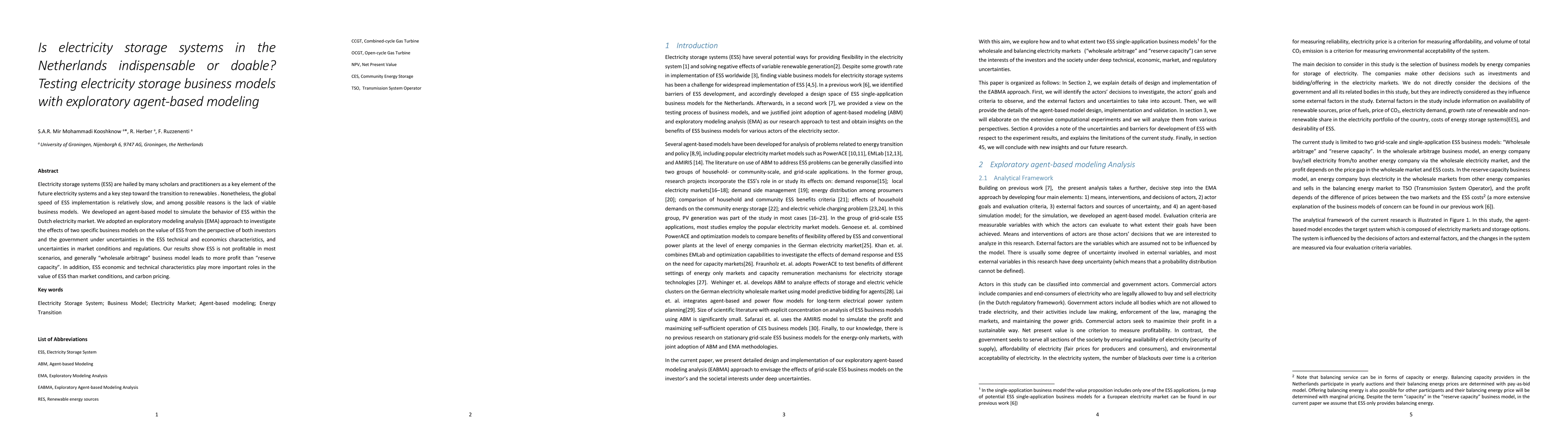 This paper explores the viability of electricity storage systems (ESS) in the Netherlands using agent-based modeling, finding that ESS is generally unprofitable under most scenarios. The study concludes that the wholesale arbitrage model yields more profit than the reserve capacity model, emphasizing the importance of ESS technical and economic characteristics over market conditions and carbon pricing.