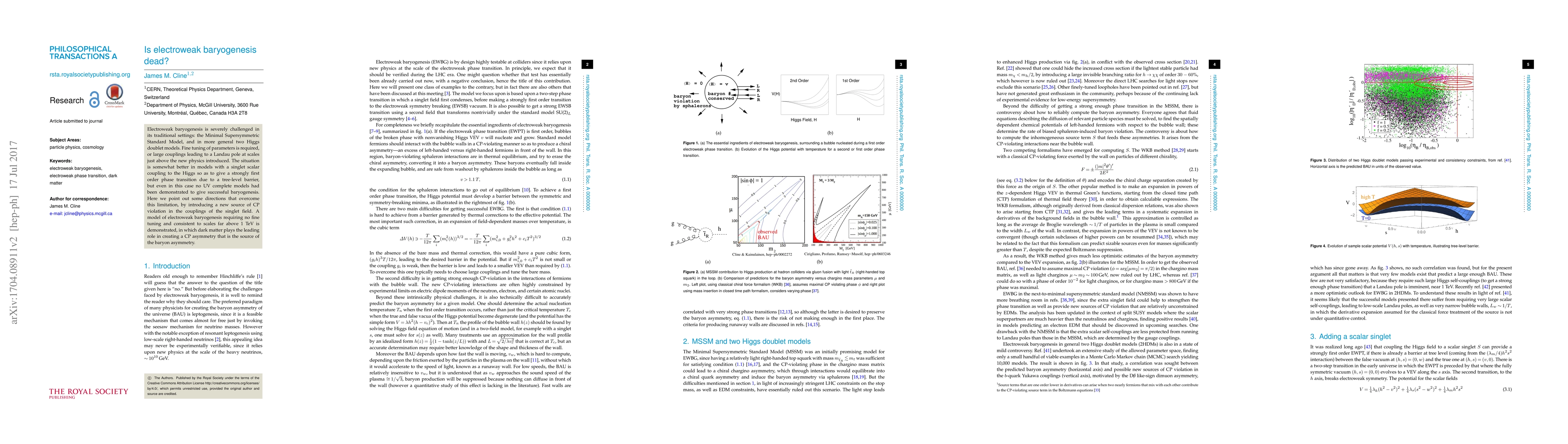 Electroweak baryogenesis is severely challenged in its traditional settings: the Minimal Supersymmetric Standard Model, and in more general two Higgs doublet models. Fine tuning of parameters is required, or large couplings leading to a Landau pole at scales just above the new physics introduced. The situation is somewhat better in models with a singlet scalar coupling to the Higgs so as to give a strongly first order phase transition due to a tree-level barrier, but even in this case no UV complete models had been demonstrated to give successful baryogenesis. Here we point out some directions that overcome this limitation, by introducing a new source of CP violation in the couplings of the singlet field. A model of electroweak baryogenesis requiring no fine tuning and consistent to scales far above 1 TeV is demonstrated, in which dark matter plays the leading role in creating a CP asymmetry that is the source of the baryon asymmetry.