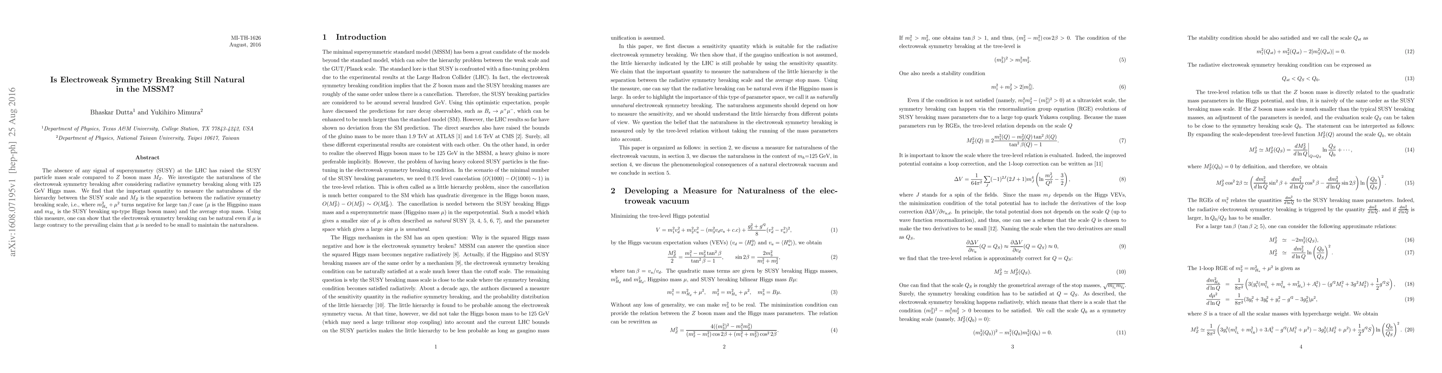 This paper examines the naturalness of electroweak symmetry breaking in the Minimal Supersymmetric Standard Model (MSSM) in light of the absence of SUSY signals at the LHC. It concludes that the hierarchy between the SUSY scale and the $Z$ boson mass can remain natural even with a large $\mu$ parameter, challenging the conventional belief that $\mu$ should be small for naturalness.