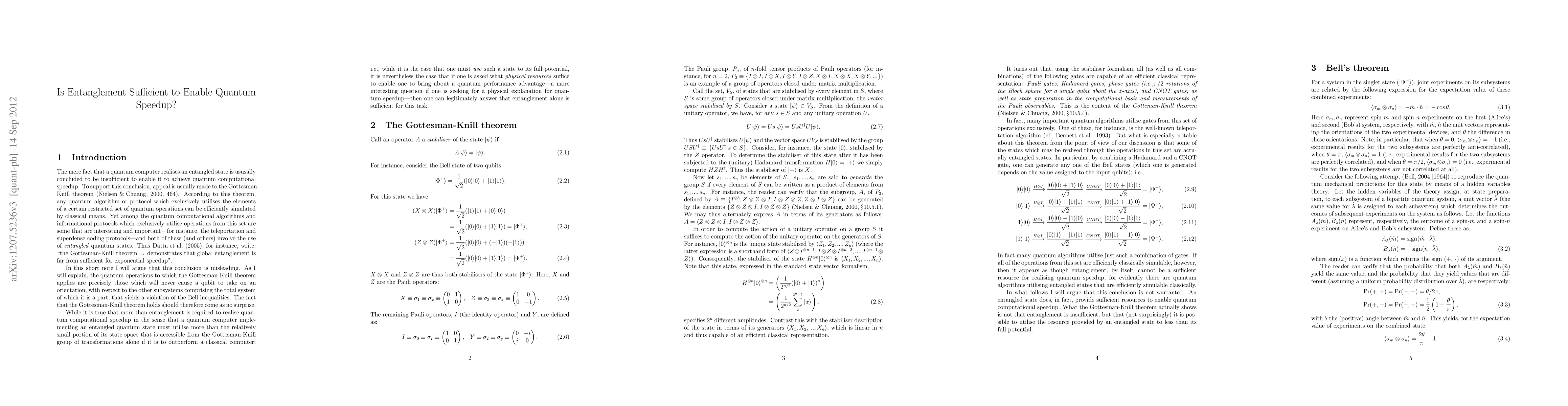 The Gottesman-Knill theorem suggests that certain quantum algorithms using restricted operations are efficiently simulable by classical computers, leading to the belief that entanglement alone cannot enable quantum speedup. However, the paper argues that entanglement still provides sufficient physical resources for quantum speedup, even if not all potential is utilized.