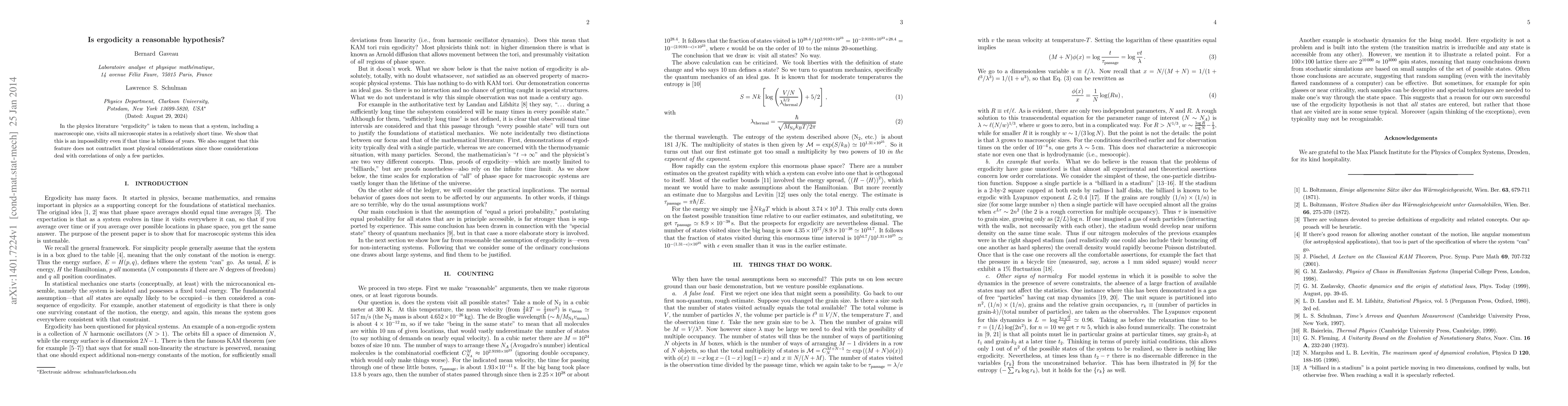 The paper argues that the concept of ergodicity, which posits that a system explores all microscopic states over time, is fundamentally flawed as it cannot be achieved even over vast timescales. It concludes that this does not significantly conflict with physical theories, as they typically focus on correlations among a small number of particles.