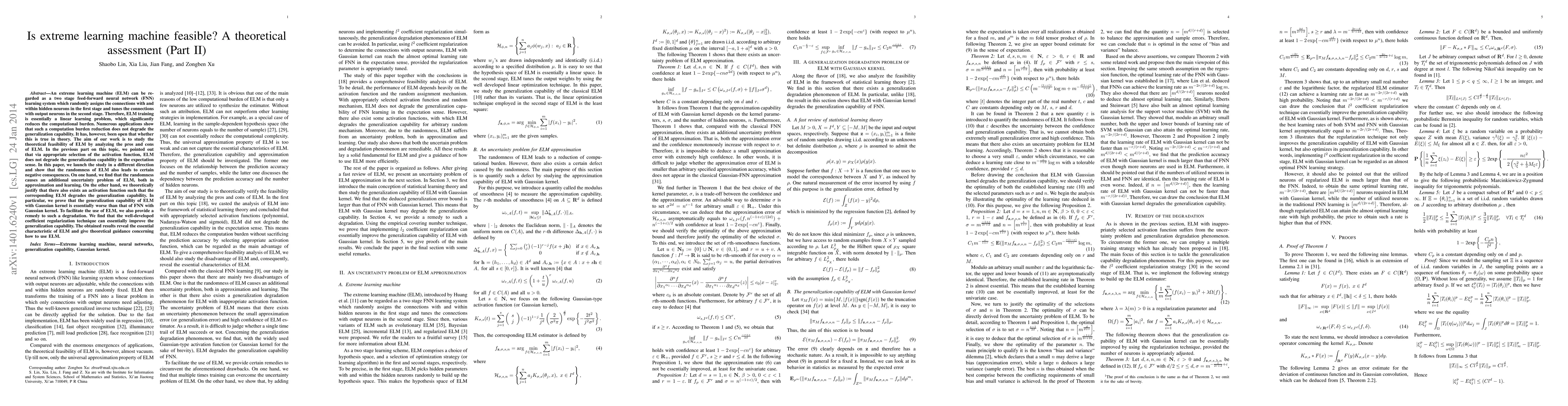 An extreme learning machine (ELM) can be regarded as a two stage feed-forward neural network (FNN) learning system which randomly assigns the connections with and within hidden neurons in the first stage and tunes the connections with output neurons in the second stage. Therefore, ELM training is essentially a linear learning problem, which significantly reduces the computational burden. Numerous applications show that such a computation burden reduction does not degrade the generalization capability. It has, however, been open that whether this is true in theory. The aim of our work is to study the theoretical feasibility of ELM by analyzing the pros and cons of ELM. In the previous part on this topic, we pointed out that via appropriate selection of the activation function, ELM does not degrade the generalization capability in the expectation sense. In this paper, we launch the study in a different direction and show that the randomness of ELM also leads to certain negative consequences. On one hand, we find that the randomness causes an additional uncertainty problem of ELM, both in approximation and learning. On the other hand, we theoretically justify that there also exists an activation function such that the corresponding ELM degrades the generalization capability. In particular, we prove that the generalization capability of ELM with Gaussian kernel is essentially worse than that of FNN with Gaussian kernel. To facilitate the use of ELM, we also provide a remedy to such a degradation. We find that the well-developed coefficient regularization technique can essentially improve the generalization capability. The obtained results reveal the essential characteristic of ELM and give theoretical guidance concerning how to use ELM.