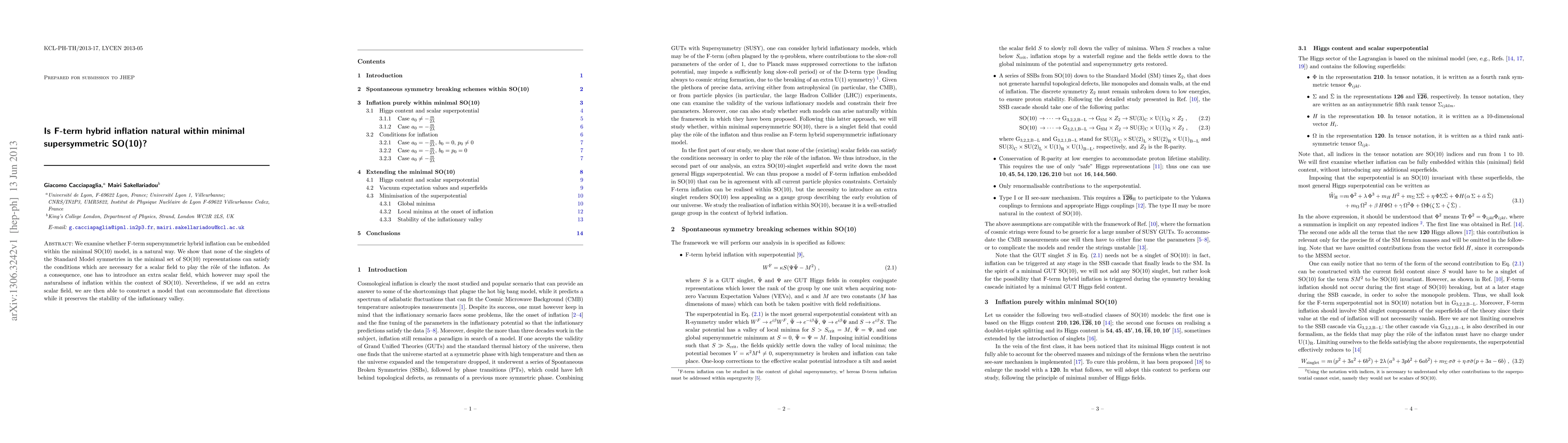 This paper investigates the feasibility of F-term hybrid inflation within the minimal supersymmetric SO(10) model, finding that none of the existing singlets can serve as the inflaton. To accommodate inflation, an extra scalar field is required, potentially compromising the naturalness of the model. However, with this addition, a stable inflationary valley can be maintained.