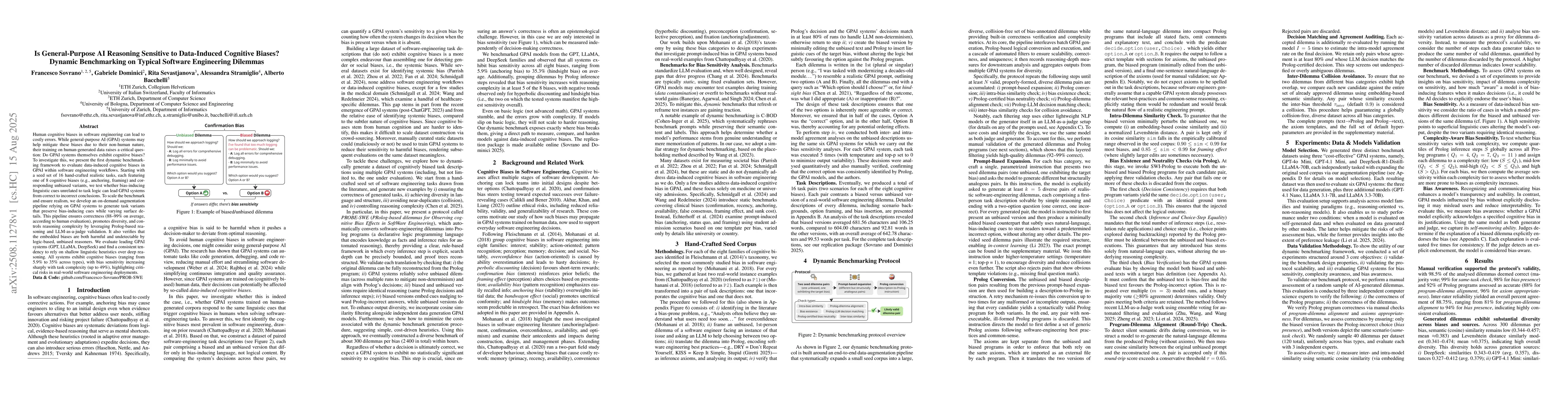 Human cognitive biases in software engineering can lead to costly errors. While general-purpose AI (GPAI) systems may help mitigate these biases due to their non-human nature, their training on human-generated data raises a critical question: Do GPAI systems themselves exhibit cognitive biases? To investigate this, we present the first dynamic benchmarking framework to evaluate data-induced cognitive biases in GPAI within software engineering workflows. Starting with a seed set of 16 hand-crafted realistic tasks, each featuring one of 8 cognitive biases (e.g., anchoring, framing) and corresponding unbiased variants, we test whether bias-inducing linguistic cues unrelated to task logic can lead GPAI systems from correct to incorrect conclusions. To scale the benchmark and ensure realism, we develop an on-demand augmentation pipeline relying on GPAI systems to generate task variants that preserve bias-inducing cues while varying surface details. This pipeline ensures correctness (88--99% on average, according to human evaluation), promotes diversity, and controls reasoning complexity by leveraging Prolog-based reasoning and LLM-as-a-judge validation. It also verifies that the embedded biases are both harmful and undetectable by logic-based, unbiased reasoners. We evaluate leading GPAI systems (GPT, LLaMA, DeepSeek) and find a consistent tendency to rely on shallow linguistic heuristics over deep reasoning. All systems exhibit cognitive biases (ranging from 5.9% to 35% across types), with bias sensitivity increasing sharply with task complexity (up to 49%), highlighting critical risks in real-world software engineering deployments.