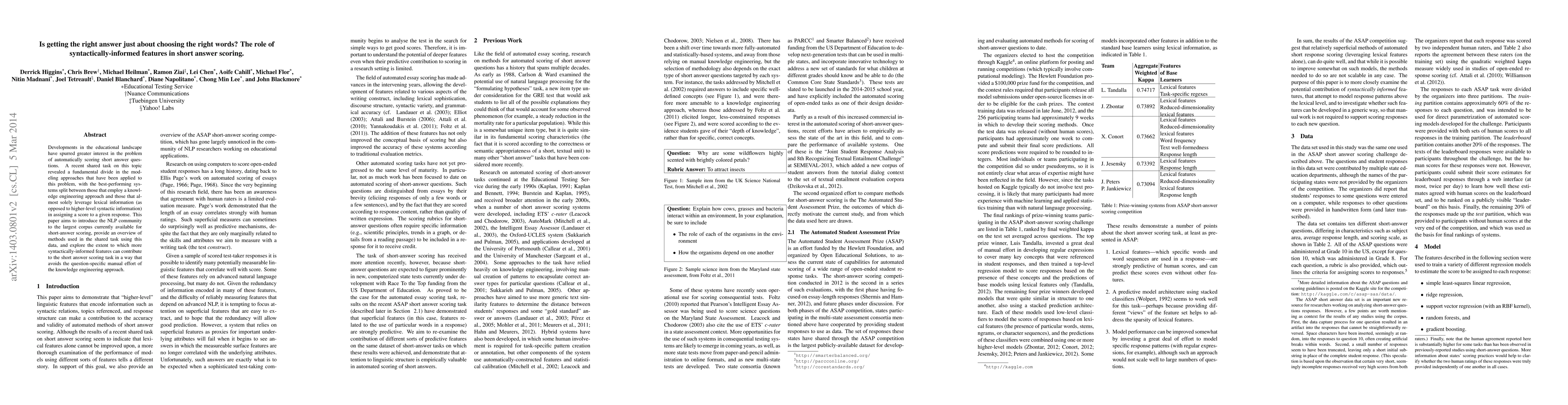 Developments in the educational landscape have spurred greater interest in the problem of automatically scoring short answer questions. A recent shared task on this topic revealed a fundamental divide in the modeling approaches that have been applied to this problem, with the best-performing systems split between those that employ a knowledge engineering approach and those that almost solely leverage lexical information (as opposed to higher-level syntactic information) in assigning a score to a given response. This paper aims to introduce the NLP community to the largest corpus currently available for short-answer scoring, provide an overview of methods used in the shared task using this data, and explore the extent to which more syntactically-informed features can contribute to the short answer scoring task in a way that avoids the question-specific manual effort of the knowledge engineering approach.