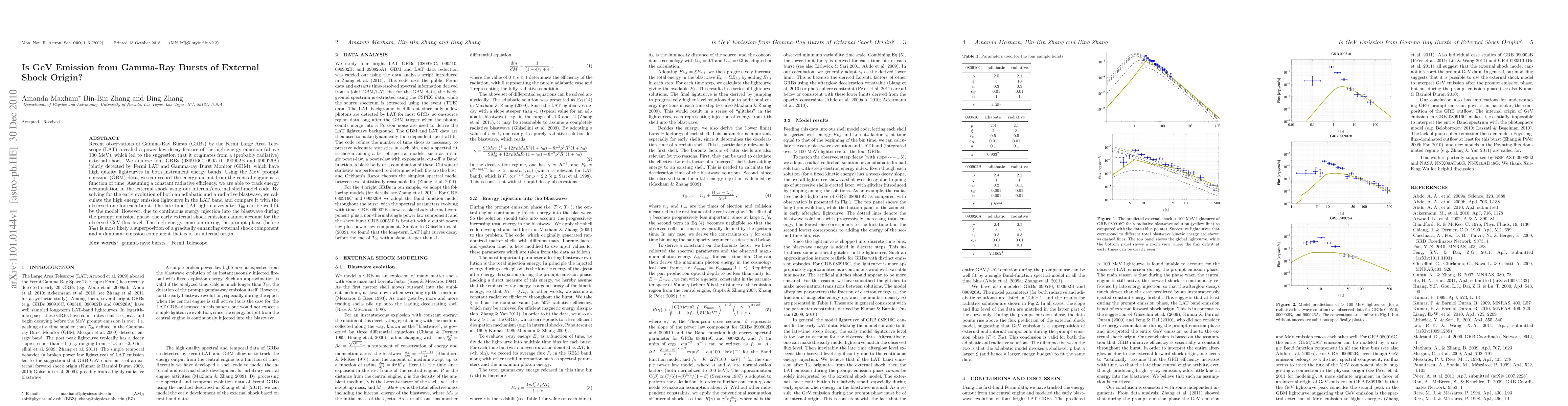 This paper investigates the origin of GeV emission in four Gamma-Ray Bursts detected by the Fermi LAT and GBM, finding that the late-time GeV emission aligns with an external shock model, while the early-time emission is likely a combination of internal and external shock components.