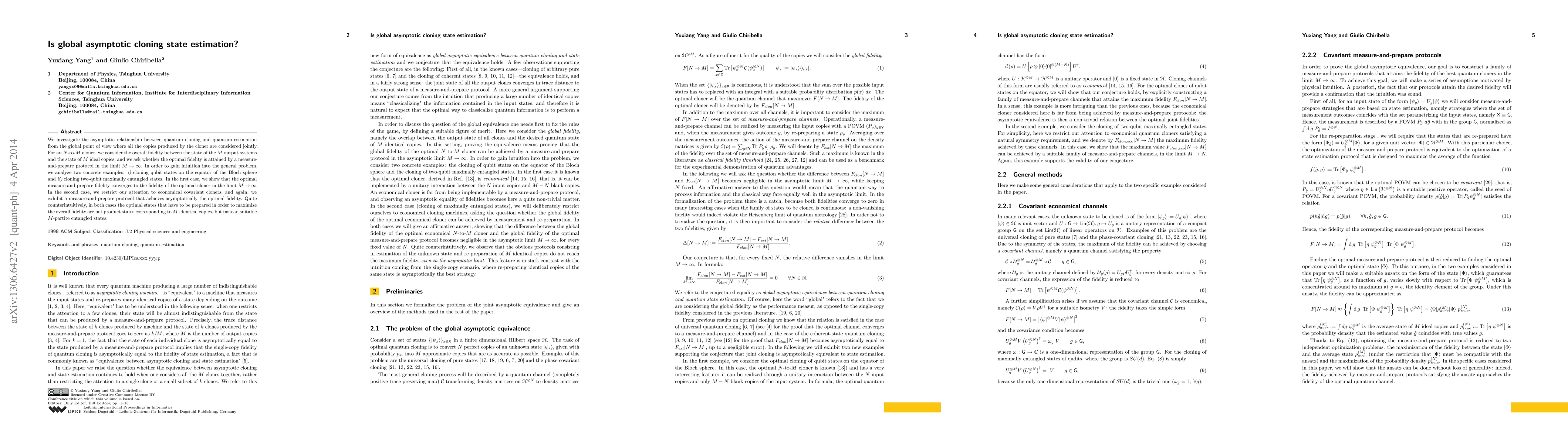 This paper investigates whether the asymptotic equivalence between quantum cloning and quantum state estimation holds when all copies are examined jointly. It finds that optimal fidelity is achieved through measure-and-prepare protocols, but surprisingly, the best states to prepare are M-partite entangled states rather than product states of identical copies.