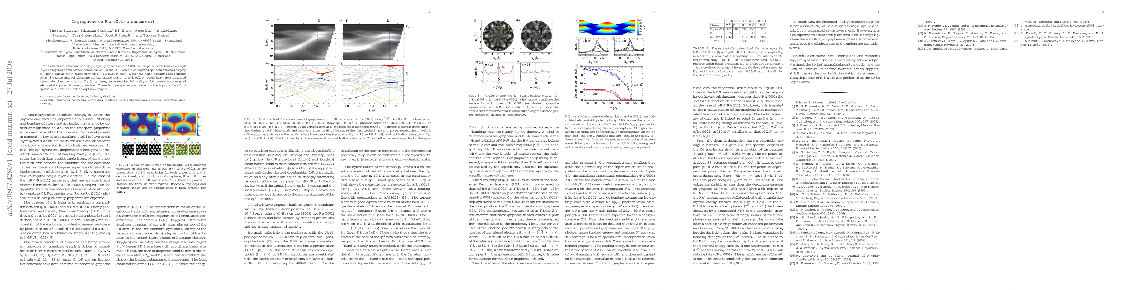 The paper presents detailed ab initio calculations using DFT to analyze the electronic structure and atomic arrangement of graphene on Ru(0001), distinguishing it from a hexagonal boron nitride nanomesh on the same substrate.
