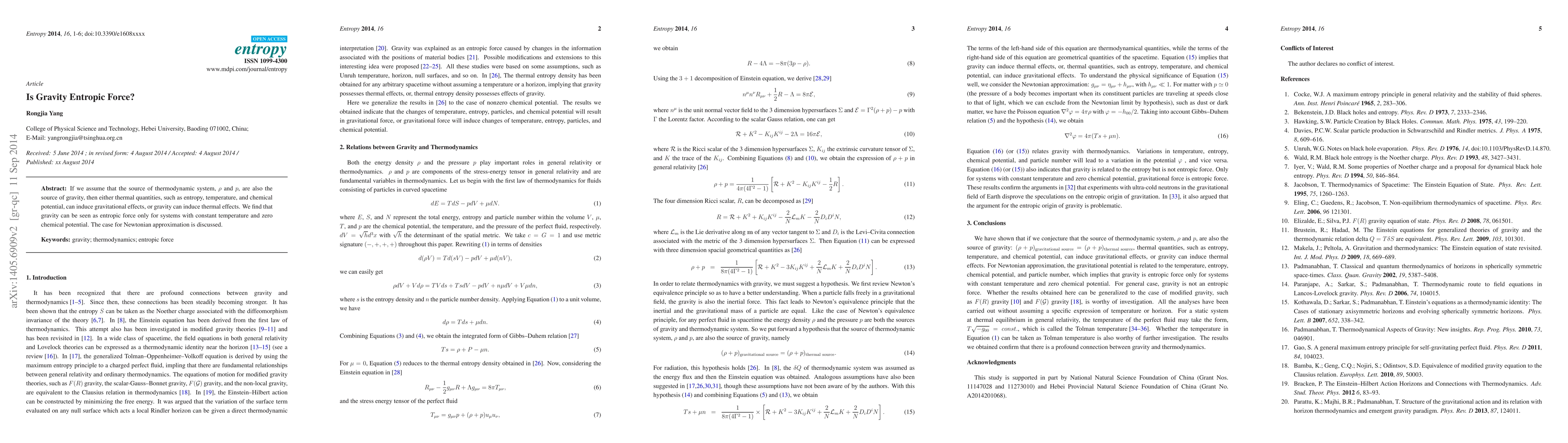This paper explores whether gravity can be viewed as an entropic force, finding that it can be interpreted as such in systems with constant temperature and zero chemical potential, particularly in the Newtonian approximation. The study highlights the interplay between thermodynamic quantities and gravitational effects.